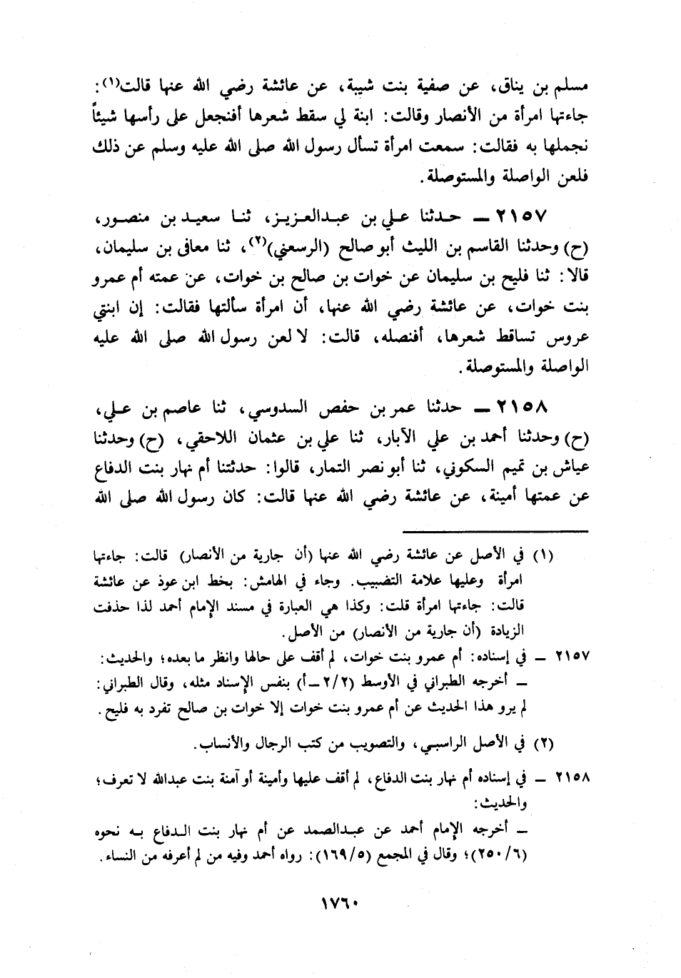 2157- حَدَّثَنَا عَلِيُّ بْنُ عَبْدِ الْعَزِيزِ، حَدَّثَنَا سَعِيدُ بْنُ مَنْصُورٍ (ح) وَحَدَّثَنَا الْقَاسِمُ بْنُ اللَّيْثِ, أَبُو صَالِحٍ الرَّسْعَنِيُّ، حَدَّثَنَا مُعَافَى بْنُ سُلَيْمَانَ، قَالاَ: حَدَّثَنَا فُلَيْحُ بْنُ سُلَيْمَانَ، عَنْ خَوَّاتِ بْنِ صَالِحِ بْنِ خَوَّاتٍ، عَنْ عَمَّتِهِ أُمِّ عَمْرٍو بِنْتِ خَوَّاتٍ، عَنْ عَائِشَةَ، رَضِيَ اللَّهُ عَنْهَا, أَنَّ امْرَأَةً سَأَلَتْهَا, فَقَالَتْ: إِنَّ ابْنَتِي عَرُوسٌ تَسَاقَطَ شَعْرُهَا, أَفَنَصِلُهُ؟ قَالَتْ: لاَ، لَعَنَ رَسُولُ اللهِ صَلى الله عَلَيه وَسَلم الْوَاصِلَةَ وَالْمُسْتَوْصِلَةَ.