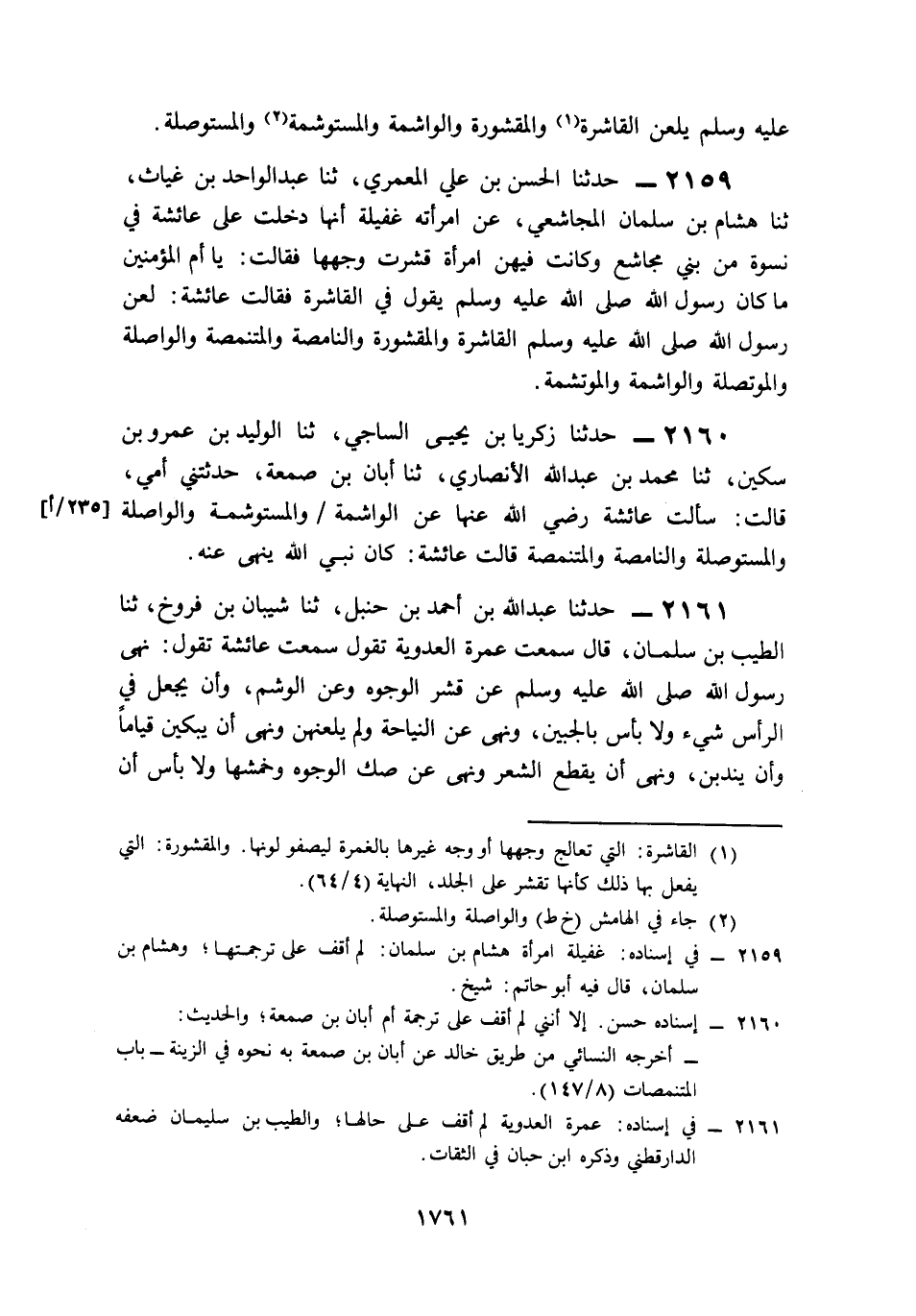 2159- حَدَّثَنَا الْحَسَنُ بْنُ عَلِيٍّ الْمَعْمَرِيُّ، حَدَّثَنَا عَبْدُ الْوَاحِدِ بْنُ غِيَاثٍ، حَدَّثَنَا هِشَامُ بْنُ سَلْمَانَ الْمُجَاشِعِيُّ، عَنِ امْرَأَتِهِ غُفَيْلَةَ, أَنَّهَا دَخَلَتْ عَلَى عَائِشَةَ فِي نِسْوَةٍ مِنْ بَنِي مُجَاشِعٍ, وَكَانَتْ فِيهِنَّ امْرَأَةٌ قَشَرَتْ وَجْهَهَا, فَقَالَتْ: يَا أُمَّ الْمُؤْمِنِينَ, مَا كَانَ رَسُولُ اللهِ صَلى الله عَلَيه وَسَلم يَقُولُ فِي الْقَاشِرَةِ؟ فَقَالَتْ عَائِشَةُ: لَعَنَ رَسُولُ اللهِ صَلى الله عَلَيه وَسَلم الْقَاشِرَةَ وَالْمَقْشُورَةَ، وَالنَّامِصَةَ وَالْمُتَنَمِّصَةَ، وَالْوَاصِلَةَ وَالْمُوتَصِلَةَ، وَالْوَاشِمَةَ وَالْمُوتَشِمَةَ.
