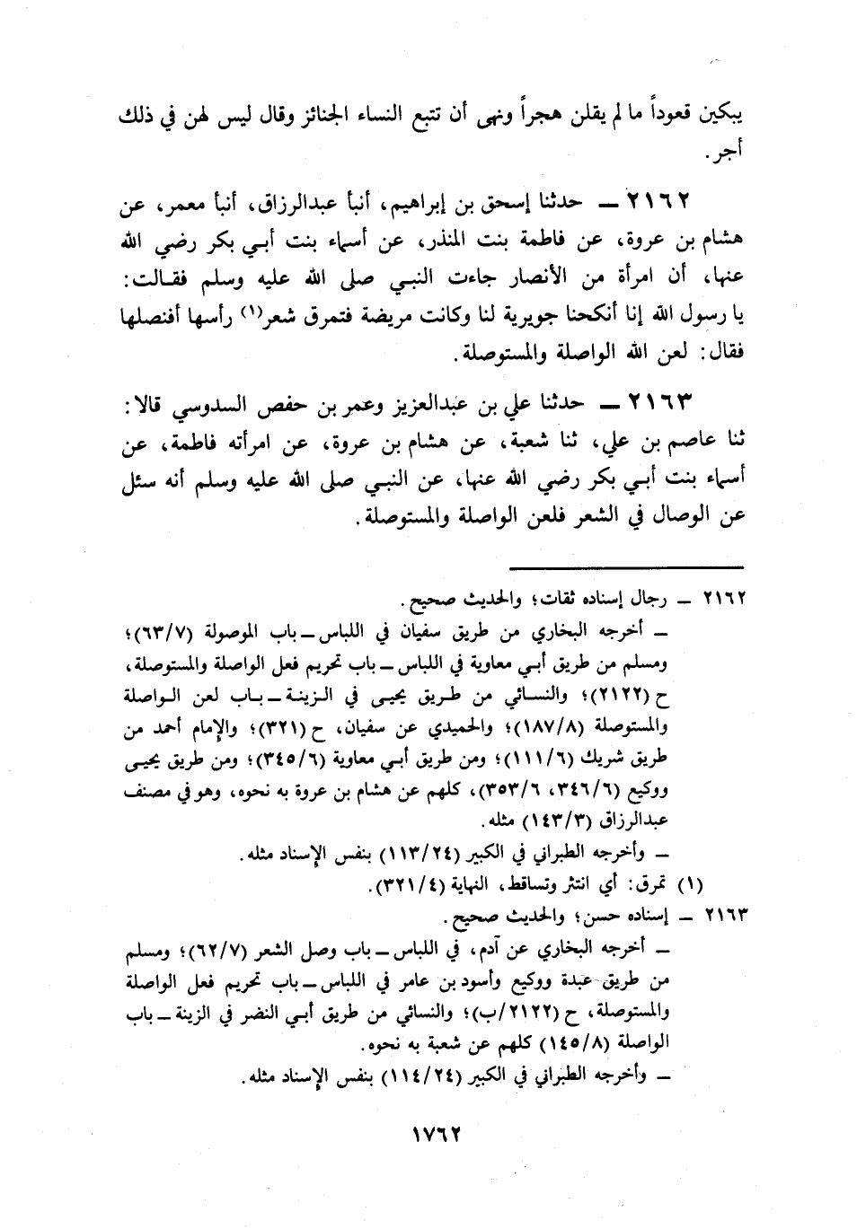 2163- حَدَّثَنَا عَلِيُّ بْنُ عَبْدِ الْعَزِيزِ، وَعُمَرُ بْنُ حَفْصٍ السَّدُوسِيُّ، قَالاَ: حَدَّثَنَا عَاصِمُ بْنُ عَلِيٍّ، حَدَّثَنَا شُعْبَةُ، عَنْ هِشَامِ بْنِ عُرْوَةَ، عَنِ امْرَأَتِهِ فَاطِمَةَ، عَنْ أَسْمَاءَ بِنْتِ أَبِي بَكْرٍ، رَضِيَ اللَّهُ عَنْهَا, عَنِ النَّبِيِّ صَلى الله عَلَيه وَسَلم, أَنَّهُ سُئِلَ عَنِ الْوِصَالِ فِي الشَّعْرِ, فَلَعَنَ الْوَاصِلَةَ وَالْمُسْتَوْصِلَةَ.