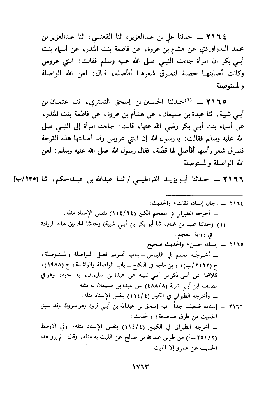 2166- حَدَّثَنَا أَبُو يَزِيدَ الْقَرَاطِيسِيُّ، حَدَّثَنَا عَبْدُ اللهِ بْنُ عَبْدِ الْحَكَمِ، حَدَّثَنَا اللَّيْثُ بْنُ سَعْدٍ، عَنْ عَمْرِو بْنِ الْحَارِثِ، عَنْ إِسْحَاقَ بْنِ عَبْدِ اللهِ بْنِ أَبِي فَرْوَةَ، عَنْ هِشَامِ بْنِ عُرْوَةَ، عَنْ فَاطِمَةَ بِنْتِ الْمُنْذِرِ، عَنْ أَسْمَاءَ بِنْتِ أَبِي بَكْرٍ، أَنَّ امْرَأَةً أَتَتِ النَّبِيَّ صَلى الله عَلَيه وَسَلم فَقَالَتْ: يَا نَبِيَّ اللهِ, إِنَّ ابْنَتِي عَرُوسٌ, وَقَدْ أَخَذَتْهَا هَذِهِ الْحَصْبَةُ فَتَسَاقَطَ شَعْرُهَا, أَفَأَصِلُهَا؟ قَالَ: لَعَنَ اللَّهُ الْوَاصِلَةَ وَالْمُسْتَوْصِلَةَ.