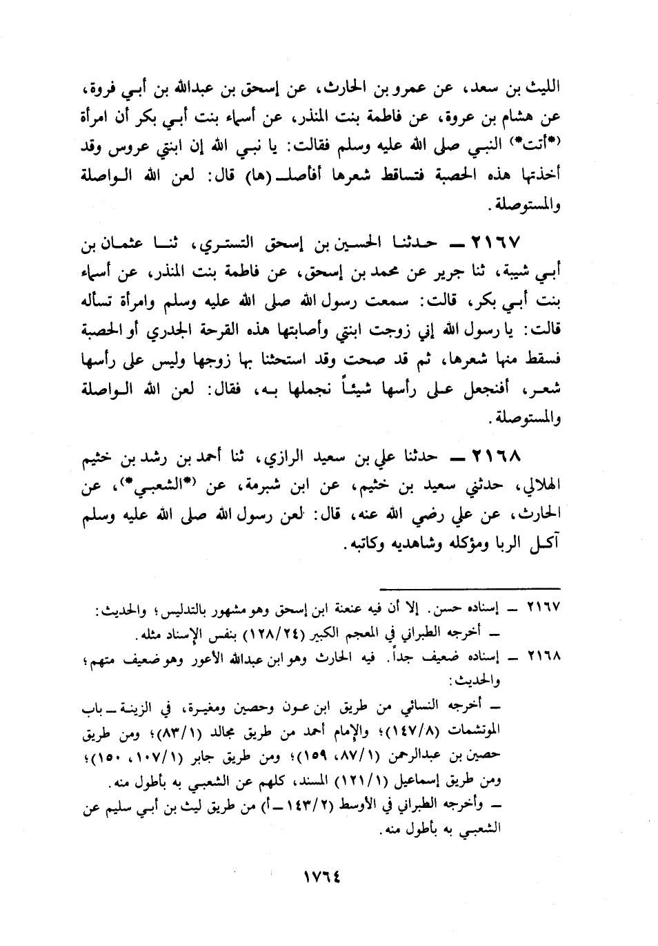 2167- حَدَّثَنَا الْحُسَيْنُ بْنُ إِسْحَاقَ التُّسْتَرِيُّ، حَدَّثَنَا عُثْمَانُ بْنُ أَبِي شَيْبَةَ، حَدَّثَنَا جَرِيرٌ، عَنْ مُحَمَّدِ بْنِ إِسْحَاقَ، عَنْ فَاطِمَةَ بِنْتِ الْمُنْذِرِ، عَنْ أَسْمَاءَ بِنْتِ أَبِي بَكْرٍ، قَالَتْ: سَمِعْتُ رَسُولَ اللهِ صَلى الله عَلَيه وَسَلم وَامْرَأَةٌ تَسْأَلُهُ قَالَتْ: يَا رَسُولَ اللهِ, إِنِّي زَوَّجْتُ ابْنَتِي, وَأَصَابَتْهَا هَذِهِ الْقُرْحَةُ الْجُدَرِيُّ, أَوِ الْحَصْبَةُ, فَسَقَطَ مِنْهَا شَعْرُهَا, ثُمَّ قَدْ صَحَّتْ وَقَدِ اسْتَحَثَّنَا بِهَا زَوْجُهَا, وَلَيْسَ عَلَى رَأْسِهَا شَعْرٌ, أَفَنَجْعَلُ عَلَى رَأْسِهَا شَيْئًا نُجَمِّلُهَا بِهِ؟ فَقَالَ: لَعَنَ اللَّهُ الْوَاصِلَةَ وَالْمُسْتَوْصِلَةَ.