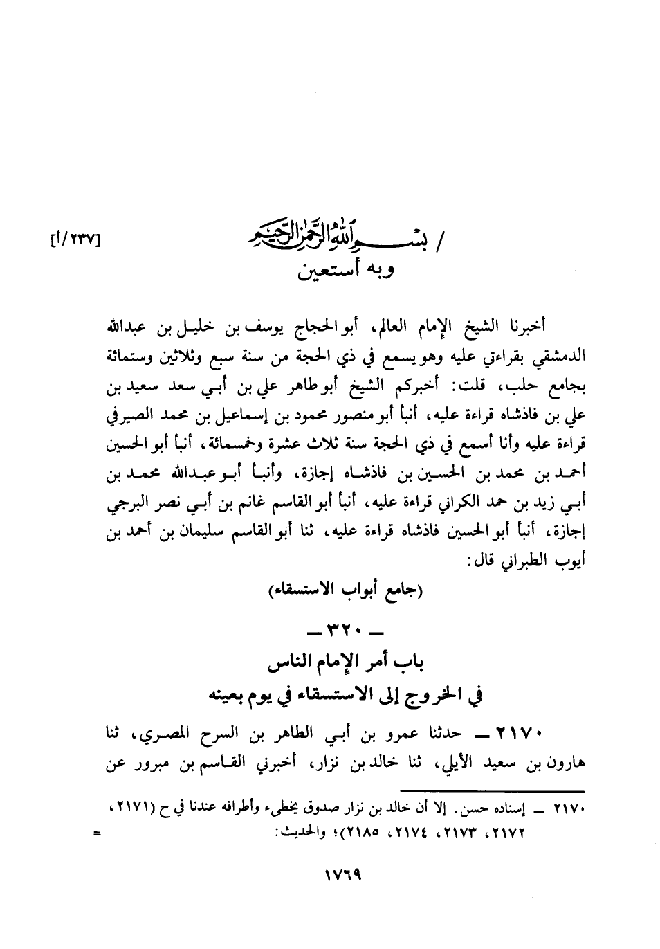 - أَخْبَرَنَا الشَّيْخُ الإِمَامُ الْعَالِمُ أَبُو الْحَجَّاجِ يُوسُفُ بْنُ خَلِيلِ بْنِ عَبْدِ اللهِ الدِّمَشْقِيُّ بِقِرَاءَتِي عَلَيْهِ وَهُوَ يَسْمَعُ, فِي ذِي الْحِجَّةِ مِنْ سَنَةِ سَبْعٍ وَثَلاَثِينَ وَسِتِّمِئَةٍ بِجَامِعِ حَلَبَ, قُلْتُ: أَخْبَرَكُمُ الشَّيْخُ أَبُو طَاهِرٍ عَلِيُّ بْنُ أَبِي سَعْدٍ سَعِيدُ بْنُ عَلِيِّ بْنِ فَاذَشَاهْ قِرَاءَةً عَلَيْهِ، أَخْبَرَنَا أَبُو مَنْصُورٍ مَحْمُودُ بْنُ إِسْمَاعِيلَ بْنِ مُحَمَّدٍ الصَّيْرَفِيُّ قِرَاءَةً عَلَيْهِ وَأَنَا أَسْمَعُ, فِي ذِي الْحِجَّةِ سَنَةَ ثَلاَثَ عَشْرَةَ وَخَمْسِمِئَةٍ, أَخْبَرَنَا أَبُو الْحُسَيْنِ أَحْمَدُ بْنُ مُحَمَّدِ بْنِ الْحُسَيْنِ بْنِ فَاذَشَاهْ إِجَازَةً، وَأَنْبَأَ أَبُو عَبْدِ اللهِ مُحَمَّدِ بْنِ أَبِي زَيْدِ بْنِ حَمَدٍ الْكُرَانِيُّ قِرَاءَةً عَلَيْهِ، أَخْبَرَنَا أَبُو الْقَاسِمِ غَانِمُ بْنُ أَبِي نَصْرٍ الْبَرْجِيُّ إِجَازَةً، أَخْبَرَنَا أَبُو الْحُسَيْنِ فَاذَشَاهْ قِرَاءَةً عَلَيْهِ، حدثَنَا أَبُو الْقَاسِمِ سُلَيْمَانُ بْنُ أَحْمَدَ بْنِ أَيُّوبَ الطَّبَرَانِيُّ قَالَ: