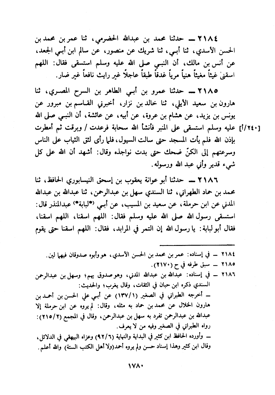 2186- حَدَّثَنَا أَبُو عَوَانَةَ يَعْقُوبُ بْنُ إِسْحَاقَ النَّيْسَابُورِيُّ الْحَافِظُ، حَدَّثَنَا مُحَمَّدُ بْنُ حَمَّادٍ الطِّهْرَانِيُّ، حَدَّثَنَا السِّنْدِيُّ سَهْلُ بْنُ عَبْدِ الرَّحْمَنِ، حَدَّثَنَا عَبْدُ اللهِ بْنُ عَبْدِ اللهِ الْمَدَنِيُّ، عَنِ ابْنِ حَرْمَلَةَ، عَنْ سَعِيدِ بْنِ الْمُسَيَّبِ، عَنْ أَبِي لُبَابَةَ عَبْدِ الْمُنْذِرِ، قَالَ: اسْتَسْقَى رَسُولُ اللهِ صَلى الله عَلَيه وَسَلم فَقَالَ: اللَّهُمَّ اسْقِنَا، اللَّهُمَّ اسْقِنَا, فَقَالَ أَبُو لُبَابَةَ: يَا رَسُولَ اللهِ, إِنَّ التَّمْرَ فِي الْمَرَابِدِ، فَقَالَ: اللَّهُمَّ اسْقِنَا, حَتَّى يَقُومَ أَبُو لُبَابَةَ عُرْيَانًا, فَيَسُدُّ ثَعْلَبَ مِرْبَدِهِ بِإِزَارِهِ، قَالَ: وَمَا يُرَى فِي السَّمَاءِ سَحَابٌ، فَأَمْطَرَتْ فَاجْتَمَعُوا إِلَى أَبِي لُبَابَةَ فَقَالُوا: إِنَّهَا لَنْ تُقْلِعَ حَتَّى تَقُومَ عُرْيَانًا, وَتَسَدُّ ثَعْلَبَ مِرْبَدِكَ بِإِزَارِكَ, كَمَا قَالَ رَسُولُ اللهِ صَلَّى اللَّهُ عَلّيْهِ وَسَلَّمَ, فَفَعَلَ, فَأَمْسَكَتِ السَّمَاءُ.