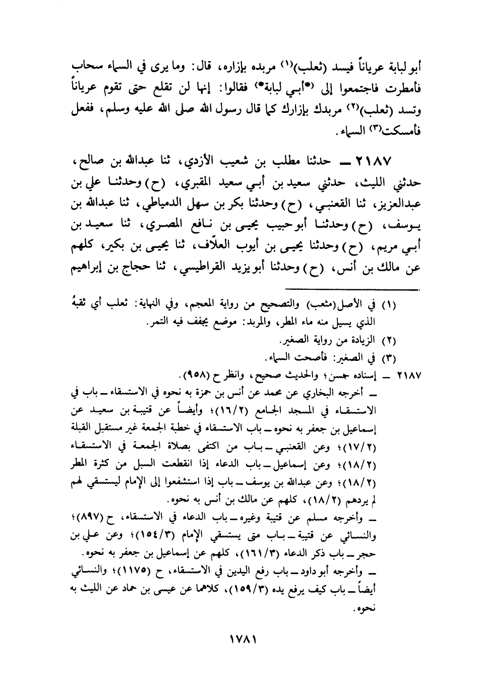 2187- حَدَّثَنَا مُطَّلِبُ بْنُ شُعَيْبٍ الأَزْدِيُّ، حَدَّثَنَا عَبْدُ اللهِ بْنُ صَالِحٍ، حَدَّثَنِي اللَّيْثُ، حَدَّثَنِي سَعِيدُ بْنُ أَبِي سَعِيدٍ الْمَقْبُرِيُّ (ح) وَحَدَّثَنَا عَلِيُّ بْنُ عَبْدِ الْعَزِيزِ، حَدَّثَنَا الْقَعْنَبِيُّ (ح) وَحَدَّثَنَا بَكْرُ بْنُ سَهْلٍ الدِّمْيَاطِيُّ، حَدَّثَنَا عَبْدُ اللهِ بْنُ يُوسُفَ (ح) وَحَدَّثَنَا أَبُو حَبِيبٍ يَحْيَى بْنُ نَافِعٍ الْمِصْرِيُّ، حَدَّثَنَا سَعِيدُ بْنُ أَبِي مَرْيَمَ (ح) وَحَدَّثَنَا يَحْيَى بْنُ أَيُّوبَ الْعَلاَّفُ، حَدَّثَنَا يَحْيَى بْنُ بُكَيْرٍ، كُلُّهُمْ عَنْ مَالِكِ بْنِ أَنَسٍ (ح) وَحَدَّثَنَا أَبُو يَزِيدَ الْقَرَاطِيسِيُّ، حَدَّثَنَا حَجَّاجُ بْنُ إِبْرَاهِيمَ الأَزْرَقُ، أَخْبَرَنَا إِسْمَاعِيلُ بْنُ جَعْفَرٍ (ح) وَحَدَّثَنَا مُصْعَبُ بْنُ إِبْرَاهِيمَ بْنِ حَمْزَةَ الزُّبَيْرِيُّ، حَدَّثَنَا أَبِي، حَدَّثَنَا أَنَسُ بْنُ عِيَاضٍ، كُلُّهُمْ عَنْ شَرِيكِ بْنِ عَبْدِ اللهِ بْنِ أَبِي نَمِرٍ، عَنْ أَنَسِ بْنِ مَالِكٍ، قَالَ: جَاءَ رَجُلٌ إِلَى النَّبِيِّ صَلى الله عَلَيه وَسَلم فَقَالَ: يَا رَسُولَ اللهِ، هَلَكَتِ الْمَوَاشِي, وَانْقَطَعَتِ السُّبُلُ، فَادْعُ اللَّهَ أَنْ يَسْقِيَنَا، فَدَعَا رَسُولُ اللهِ صَلى الله عَلَيه وَسَلم فَقَالَ: اللَّهُمَّ اسْقِنِي, وَمَا يُرَى فِي السَّمَاءِ قَزَعَةُ سَحَابٍ, فَمُطِرْنَا مِنَ الْجُمُعَةِ إِلَى الْجُمُعَةِ, فَجَاءَ رَجُلٌ, فَقَالَ: يَا رَسُولَ اللهِ, تَهَدَّمَتِ الْبُيُوتُ, وَانْقَطَعَتِ السُّبُلُ, وَهَلَكَتِ الْمَوَاشِي, فَادْعُ اللَّهَ أَنْ يَرْفَعَهَا عَنَّا، قَالَ رَسُولُ اللهِ صَلى الله عَلَيه وَسَلم: اللَّهُمَّ حَوَالَيْنَا وَلاَ عَلَيْنَا، وَلَكِنْ عَلَى رُؤُوسِ الْجِبَالِ وَالآكَامِ, وَبُطُونِ الأَوْدِيَةِ, وَمَنَابِتِ الشَّجَرِ, فَانْجَابَتْ عَنِ الْمَدِينَةِ.
