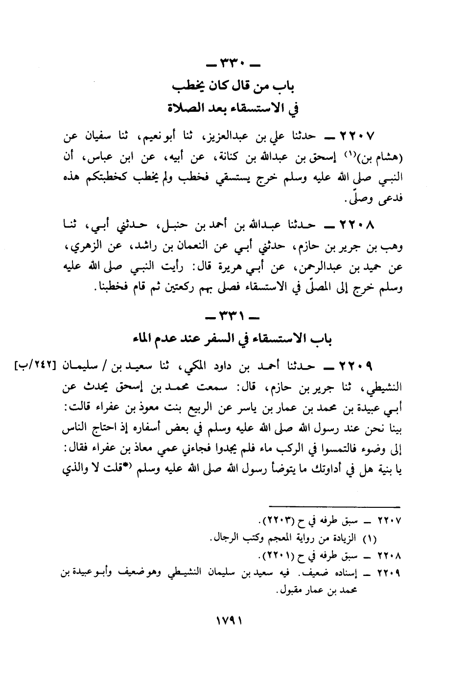 2209- حَدَّثَنَا أَحْمَدُ بْنُ دَاوُدَ الْمَكِّيُّ، حَدَّثَنَا سَعِيدُ بْنُ سُلَيْمَانَ الْنَشِيطِيُّ، حَدَّثَنَا جَرِيرُ بْنُ حَازِمٍ، قَالَ: سَمِعْتُ مُحَمَّدَ بْنَ إِسْحَاقَ يُحَدِّثُ عَنْ أَبِي عُبَيْدَةَ بْنِ مُحَمَّدِ بْنِ عَمَّارِ بْنِ يَاسِرٍ، عَنِ الرُّبَيِّعِ بِنْتِ مُعَوِّذِ بْنِ عَفْرَاءَ، قَالَتْ: بَيْنَا نَحْنُ عِنْدَ رَسُولِ اللهِ صَلى الله عَلَيه وَسَلم فِي بَعْضِ أَسْفَارِهِ, إِذِ احْتَاجَ النَّاسُ إِلَى وَضُوءٍ, فَالْتَمَسُوا فِي الرَّكْبِ مَاءً, فَلَمْ يَجِدُوا، فَجَاءَنِي عَمِّي مُعَاذُ بْنُ عَفْرَاءَ فَقَالَ: يَا بُنَيَّةُ, هَلْ فِي إِدَاوَتِكِ مَا يَتَوَضَّأُ رَسُولُ اللهِ صَلى الله عَلَيه وَسَلم؟ قُلْتُ: لاَ، وَالَّذِي بَعَثَهُ بِالْحَقِّ, مَا فِيهَا شَيْءٌ، فَأَتَى رَسُولَ اللهِ صَلى الله عَلَيه وَسَلم فَقَالَ: مَا فِي الرَّكْبِ مَاءٌ, فَدَعَا رَسُولُ اللهِ صَلى الله عَلَيه وَسَلم, فَأَمْطَرَتْ, حَتَّى اسْتَقَى النَّاسُ وَسَقَوْا.