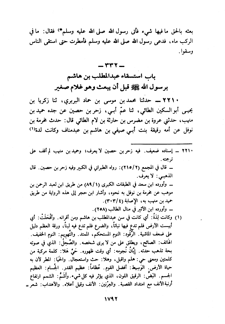 2210- حَدَّثَنَا مُحَمَّدُ بْنُ مُوسَى بْنِ حَمَّادٍ الْبَرْبَرِيُّ، حَدَّثَنَا زَكَرِيَّا بْنُ يَحْيَى, أَبُو السُّكَينِ الطَّائِيُّ، حَدَّثَنَا عَمُّ أَبِي زَحْرِ بْنُ حُصَيْنٍ، عَنْ جَدِّهِ حُمَيْدِ بْنِ مِنْهَبٍ، حَدَّثَنِي عُرْوَةُ بْنُ مُضَرِّسِ بْنِ حَارِثَةَ بْنِ لَأْمٍ الطَّائِيُّ، قَالَ: حَدَّثَ مَخْرَمَةُ بْنُ نَوْفَلٍ، عَنْ أُمِّهِ رُقَيْقَةَ بِنْتِ أَبِي صَيْفِيِّ بْنِ هَاشِمِ بْنِ عَبْدِ مَنَافٍ، وَكَانَتْ لِدَة عَبْدِ الْمُطَّلِبِ قَالَتْ: تَتَابَعَتْ عَلَى قُرَيْشٍ سِنُونَ (1) أَقْحَلَتِ (2) الضَّرْعَ, وَأَرَقَّتِ الْعَظْمَ, فَبَيْنَا أَنَا رَاقِدَةٌ الهَمّ أَوْ مَهْمُومَةٌ, فَإِذَا هَاتِفٌ يَصْرُخُ بِصَوْتٍ صَحِلٍ, يَقُولُ: مَعْشَرَ قُرَيْشٍ إِنَّ هَذَا النَّبِيَّ الْمَبْعُوثَ قَدْ أَظَلَّتْكُمْ أَيَّامُهُ، وَهَذَا إِبَّانُ نُجُومِهِ, فَحَيَّ هَلاَّ بِالْحَيَا وَالْخِصْبِ,
