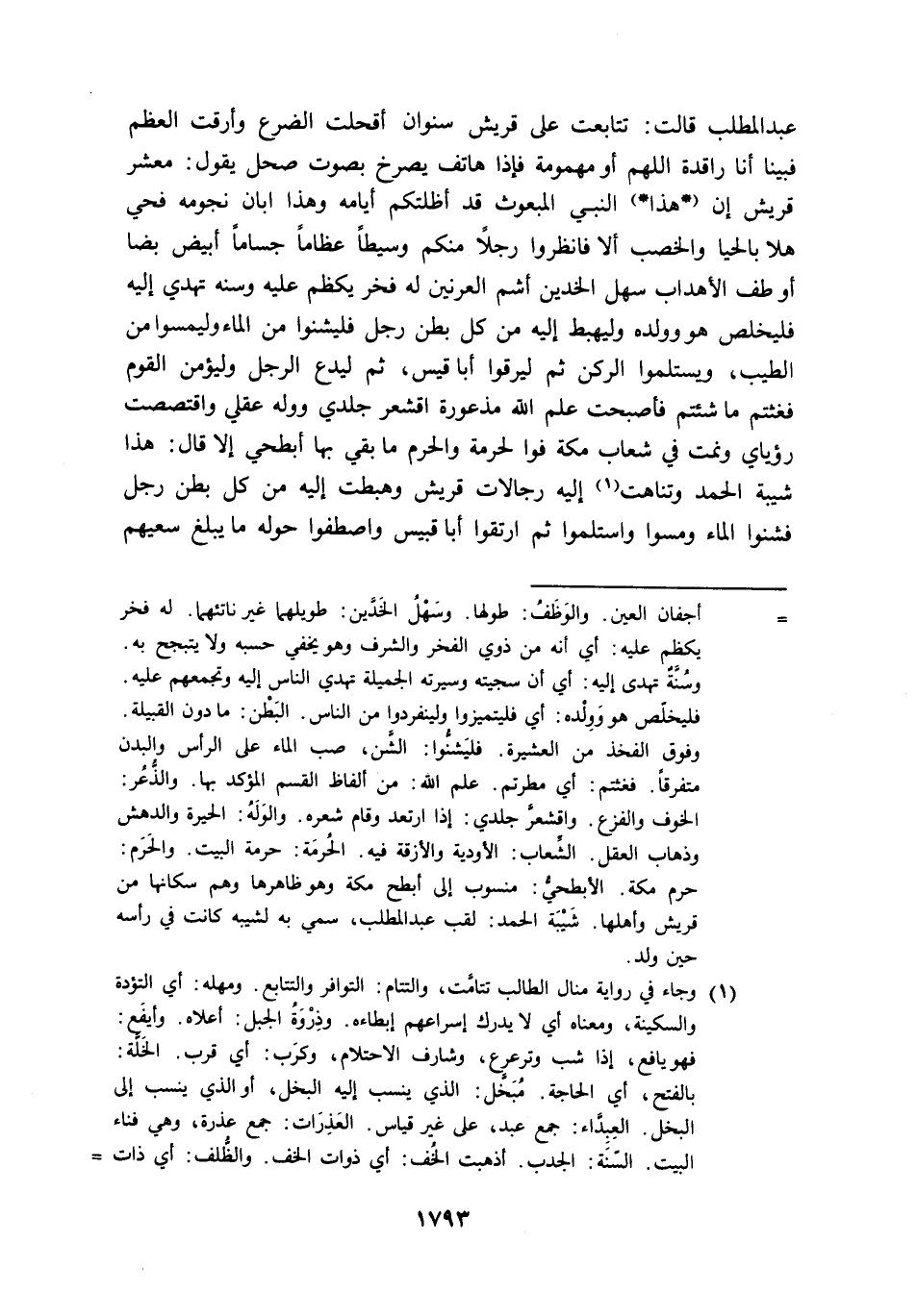 فَقَالَ: اللَّهُمَّ سَادَّ الْخَلَّةِ, وَكَاشِفَ الْكُرْبَةِ, أَنْتَ مُعَلَّمِ غَيْرُ مُعَلَّمٍ, مَسْؤولٌ غَيْرُ مُبَخَّلٍ, وَهَذِهِ عَبْدَاؤُكَ وَإِمَاؤُكَ بِعَذَرَاتِ حَرَمِكَ يَشْكُونَ إِلَيْكَ سَنَتَهُمْ, أَذْهَبَتِ الْخُفَّ وَالظِّلْفَ، اللَّهُمَّ فَأَمْطِرَنْ عَلَيْنَا مُغْدِقًا مَرْتَعًا, فَوَرَبِّ الْكَعْبَةِ مَا رَامُوا, حَتَّى تَفَجَّرَتِ السَّمَاءُ بِمَا فِيهَا, وَاكْتَظَّ الْوَادِي بِثَجِيجِهِ, فَسَمِعْتُ شِيخَانَ قُرَيْشٍ وَجِلَّتَهَا عَبْدَ اللهِ بْنَ جُدْعَانَ, وَحَرْبَ بْنَ أُمَيَّةَ, وَهِشَامَ بْنَ الْمُغِيرَةِ يَقُولُونَ لِعَبْدِ الْمُطَّلِبِ: هَنِيئًا لَكَ أَبَا الْبَطْحَاءِ, أَيْ عَاشَ بِكَ أَهْلُ الْبَطْحَاءِ, وَفِي ذَلِكَ مَا تَقُولُ رُقَيْقَةُ بِنْتُ أَبِي صَيْفِيٍّ: