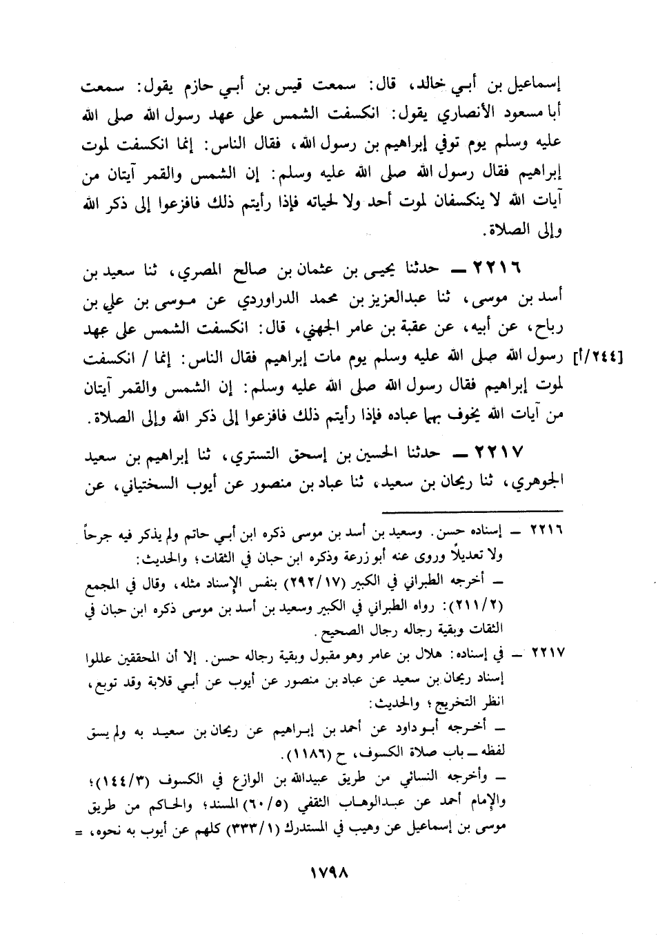 2216- حَدَّثَنَا يَحْيَى بْنُ عُثْمَانَ بْنِ صَالِحٍ الْمِصْرِيُّ، حَدَّثَنَا سَعِيدُ بْنُ أَسَدِ بْنِ مُوسَى، حَدَّثَنَا عَبْدُ الْعَزِيزِ بْنُ مُحَمَّدٍ الدَّرَاوَرْدِيُّ، عَنْ مُوسَى بْنِ عَلِيِّ بْنِ رَبَاحٍ، عَنْ أَبِيهِ، عَنْ عُقْبَةَ بْنِ عَامِرٍ الْجُهَنِيِّ، قَالَ: انْكَسَفَتِ الشَّمْسُ عَلَى عَهْدِ رَسُولِ اللهِ صَلى الله عَلَيه وَسَلم يَوْمَ مَاتَ إِبْرَاهِيمُ, فَقَالَ النَّاسُ: إِنَّمَا انْكَسَفَتْ لِمَوْتِ إِبْرَاهِيمَ، فَقَالَ رَسُولُ اللهِ صَلى الله عَلَيه وَسَلم: إِنَّ الشَّمْسَ وَالْقَمَرَ آيَتَانِ مِنْ آيَاتِ اللهِ, يُخَوِّفُ بِهِمَا عِبَادَهُ، فَإِذَا رَأَيْتُمْ ذَلِكَ, فَافْزَعُوا إِلَى ذِكْرِ اللهِ وَإِلَى الصَّلاَةِ.