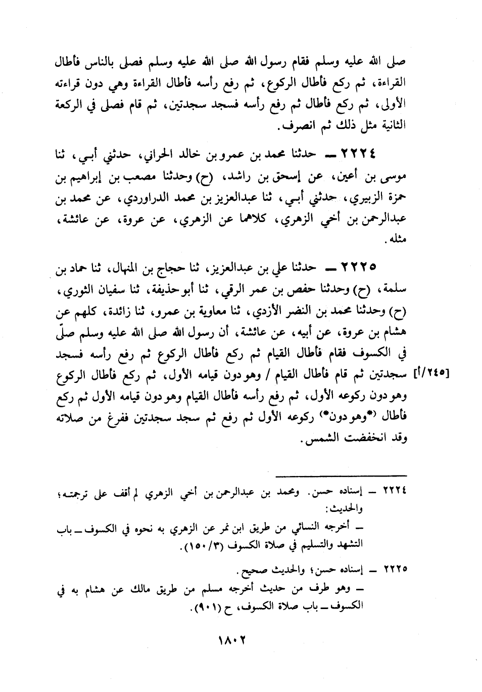 2225- حَدَّثَنَا عَلِيُّ بْنُ عَبْدِ الْعَزِيزِ، حَدَّثَنَا حَجَّاجُ بْنُ الْمِنْهَالِ، حَدَّثَنَا حَمَّادُ بْنُ سَلَمَةَ (ح) وَحَدَّثَنَا حَفْصُ بْنُ عُمَرَ الرَّقِّيُّ، حَدَّثَنَا أَبُو حُذَيْفَةَ، حَدَّثَنَا سُفْيَانُ الثَّوْرِيُّ (ح) وَحَدَّثَنَا مُحَمَّدُ بْنُ النَّضْرِ الأَزْدِيُّ، حَدَّثَنَا مُعَاوِيَةُ بْنُ عَمْرٍو، حَدَّثَنَا زَائِدَةُ، كُلُّهُمْ عَنْ هِشَامِ بْنِ عُرْوَةَ، عَنْ أَبِيهِ، عَنْ عَائِشَةَ، أَنَّ رَسُولَ اللهِ صَلى الله عَلَيه وَسَلم صَلَّى فِي الْكُسُوفِ, فَقَامَ, فَأَطَالَ الْقِيَامَ، ثُمَّ رَكَعَ, فَأَطَالَ الرُّكُوعَ، ثُمَّ رَفَعَ رَأْسَهُ, فَسَجَدَ سَجْدَتَيْنِ، ثُمَّ قَامَ, فَأَطَالَ الْقِيَامَ، وَهُوَ دُونَ قِيَامِهِ الأَوَّلِ، ثُمَّ رَكَعَ, فَأَطَالَ الرُّكُوعَ وَهُوَ دُونَ رُكُوعِهِ الأَوَّلِ، ثُمَّ رَفَعَ رَأْسَهُ, فَأَطَالَ الْقِيَامَ وَهُوَ دُونَ قِيَامِهِ الأَوَّلِ، ثُمَّ رَكَعَ, فَأَطَالَ وَهُوَ دُونَ رُكُوعِهِ الأَوَّلِ، ثُمَّ رَفَعَ, ثُمَّ سَجَدَ سَجْدَتَيْنِ فَفَرَغَ مِنْ صَلاَتِهِ وَقَدِ انْخَفَضَتِ الشَّمْسُ.
