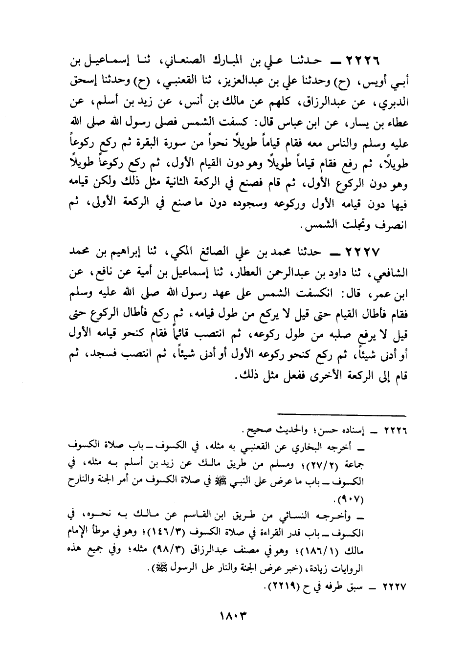 2226- حَدَّثَنَا عَلِيُّ بْنُ الْمُبَارَكِ الصَّنْعَانِيُّ، حَدَّثَنَا إِسْمَاعِيلُ بْنُ أَبِي أُوَيْسٍ (ح) وَحَدَّثَنَا عَلِيُّ بْنُ عَبْدِ الْعَزِيزِ، حَدَّثَنَا الْقَعْنَبِيُّ (ح) وَحَدَّثَنَا إِسْحَاقُ الدَّبَرِيُّ، عَنْ عَبْدِ الرَّزَّاقِ، كُلُّهُمْ عَنْ مَالِكِ بْنِ أَنَسٍ، عَنْ زَيْدِ بْنِ أَسْلَمَ، عَنْ عَطَاءِ بْنِ يَسَارٍ، عَنِ ابْنِ عَبَّاسٍ، قَالَ: كَسَفَتِ الشَّمْسُ, فَصَلَّى رَسُولُ اللهِ صَلى الله عَلَيه وَسَلم وَالنَّاسُ مَعَهُ فَقَامَ قِيَامًا طَوِيلاً نَحْوًا مَعَ سُورَةِ الْبَقَرَةِ, ثُمَّ رَكَعَ رُكُوعًا طَوِيلاً ثُمَّ رَفَعَ فَقَامَ قِيَامًا طَوِيلاً وَهُوَ دُونَ الْقِيَامِ الأَوَّلِ، ثُمَّ رَكَعَ رُكُوعًا طَوِيلاً وَهُوَ دُونَ الرُّكُوعِ الأَوَّلِ، ثُمَّ قَامَ فَصَنَعَ فِي الرَّكْعَةِ الثَّانِيَةِ مِثْلَ ذَلِكَ, وَلَكِنْ قِيَامُهُ فِيهَا دُونَ قِيَامِهِ الأَوَّلِ, وَرُكُوعُهُ وَسُجُودُهُ دُونَ مَا صَنَعَ فِي الرَّكْعَةِ الأُولَى, ثُمَّ انْصَرَفَ وَتَجَلَّتِ الشَّمْسُ.