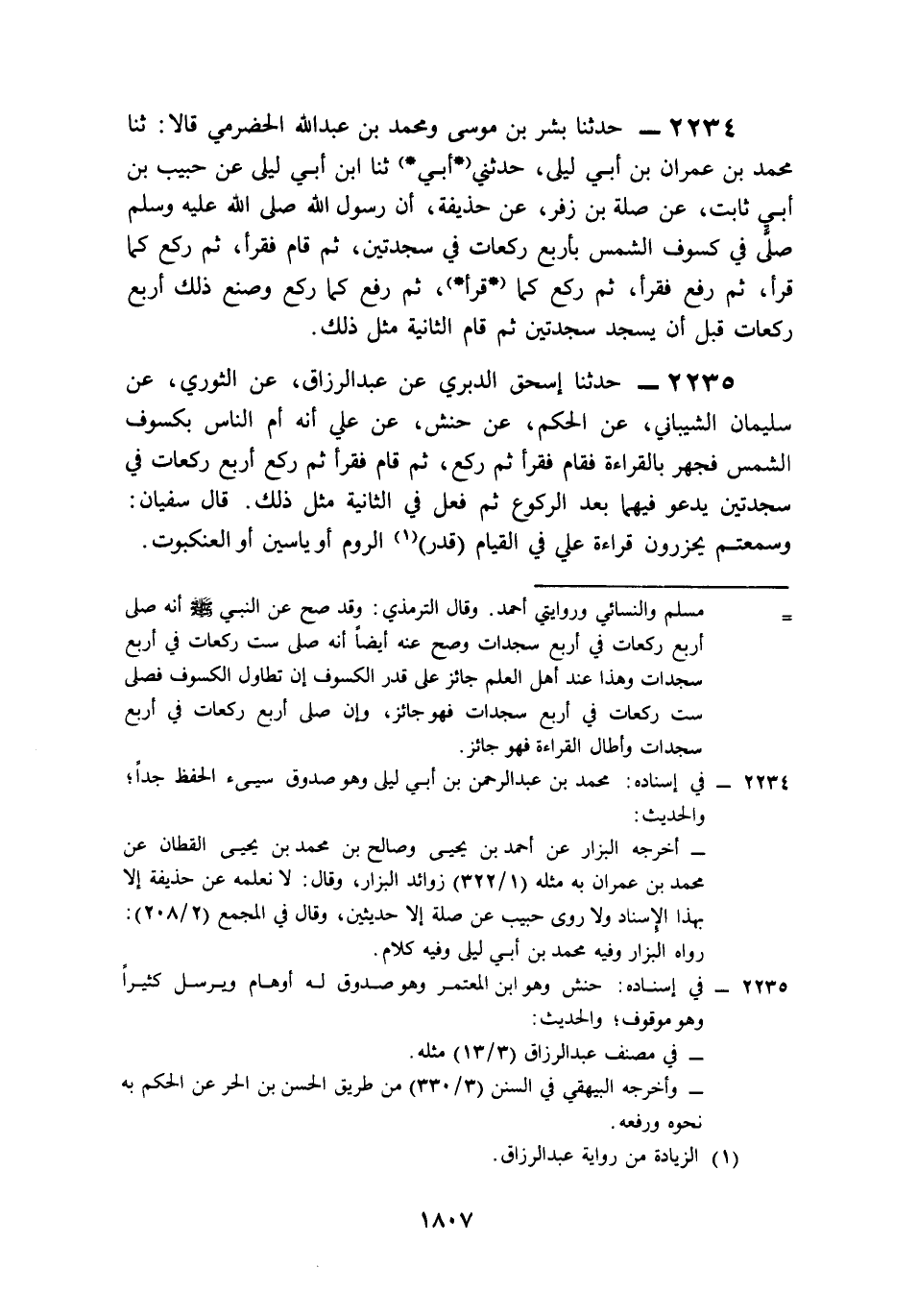 2234- حَدَّثَنَا بِشْرُ بْنُ مُوسَى، وَمُحَمَّدُ بْنُ عَبْدِ اللهِ الْحَضْرَمِيُّ، قَالاَ: حَدَّثَنَا مُحَمَّدُ بْنُ عِمْرَانَ بْنِ أَبِي لَيْلَى، حَدَّثَنِي أَبِي، حَدَّثَنَا ابْنُ أَبِي لَيْلَى، عَنْ حَبِيبِ بْنِ أَبِي ثَابِتٍ، عَنْ صِلَةَ بْنِ زُفَرَ، عَنْ حُذَيْفَةَ، أَنَّ رَسُولَ اللهِ صَلى الله عَلَيه وَسَلم صَلَّى فِي كُسُوفِ الشَّمْسِ بِأَرْبَعِ رَكَعَاتٍ فِي سَجْدَتَيْنِ، ثُمَّ قَامَ فَقَرَأَ، ثُمَّ رَكَعَ كَمَا قَرَأَ، ثُمَّ رَفَعَ فَقَرَأَ، ثُمَّ رَكَعَ كَمَا قَرَأَ، ثُمَّ رَفَعَ كَمَا رَكَعَ، وَصَنَعَ ذَلِكَ أَرْبَعَ رَكَعَاتٍ, قَبْلَ أَنْ يَسْجُدَ سَجْدَتَيْنِ، ثُمَّ قَامَ الثَّانِيَةَ مِثْلَ ذَلِكَ.