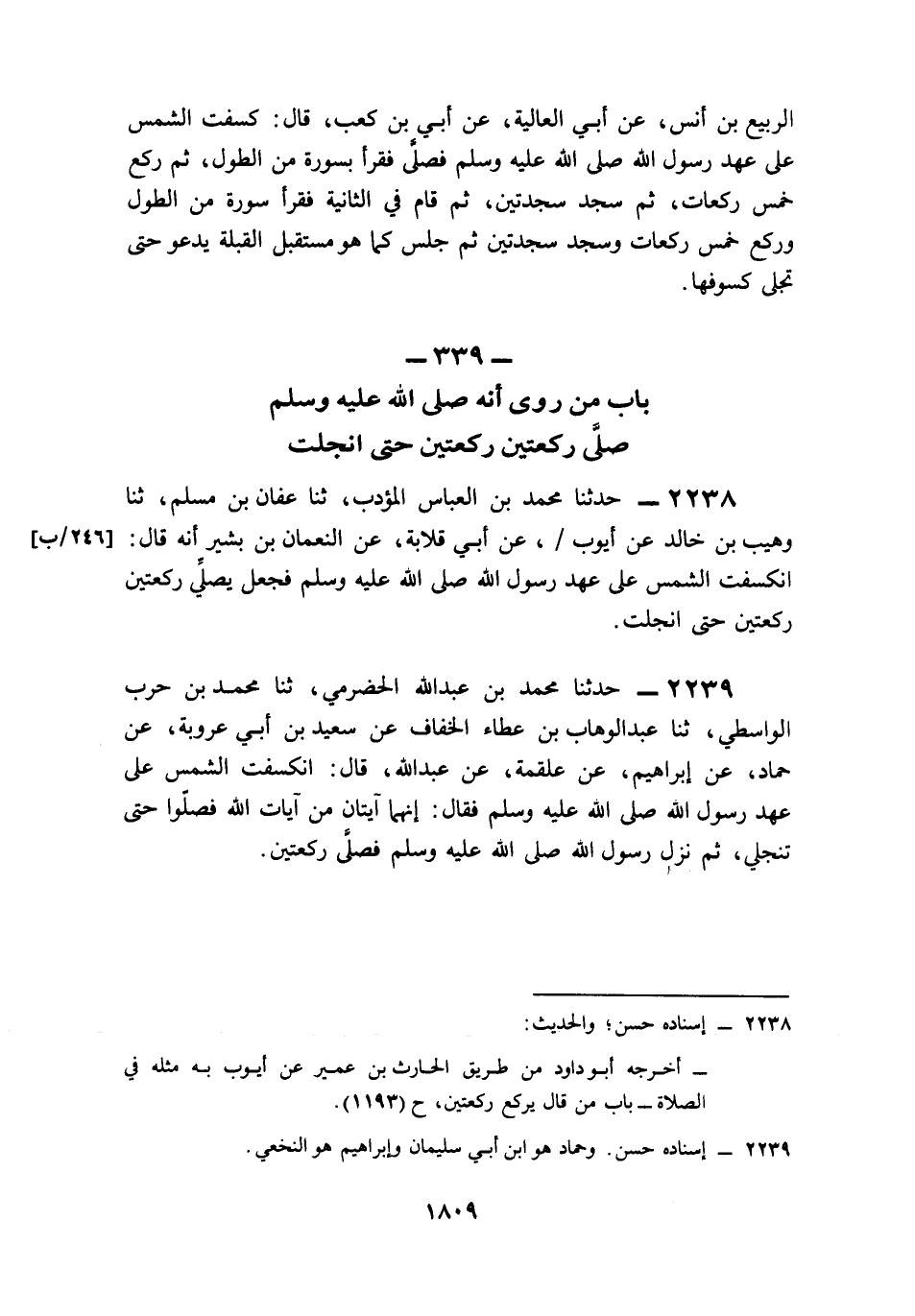 2238- حَدَّثَنَا مُحَمَّدُ بْنُ الْعَبَّاسِ الْمُؤَدِّبُ، حَدَّثَنَا عَفَّانُ بْنُ مُسْلِمٍ، حَدَّثَنَا وُهَيْبُ بْنُ خَالِدٍ، عَنْ أَيُّوبَ، عَنْ أَبِي قِلاَبَةَ، عَنِ النُّعْمَانِ بْنِ بَشِيرٍ، أَنَّهُ قَالَ: انْكَسَفَتِ الشَّمْسُ عَلَى عَهْدِ رَسُولِ اللهِ صَلى الله عَلَيه وَسَلم, فَجَعَلَ يُصَلِّي رَكْعَتَيْنِ رَكْعَتَيْنِ حَتَّى انْجَلَتْ.