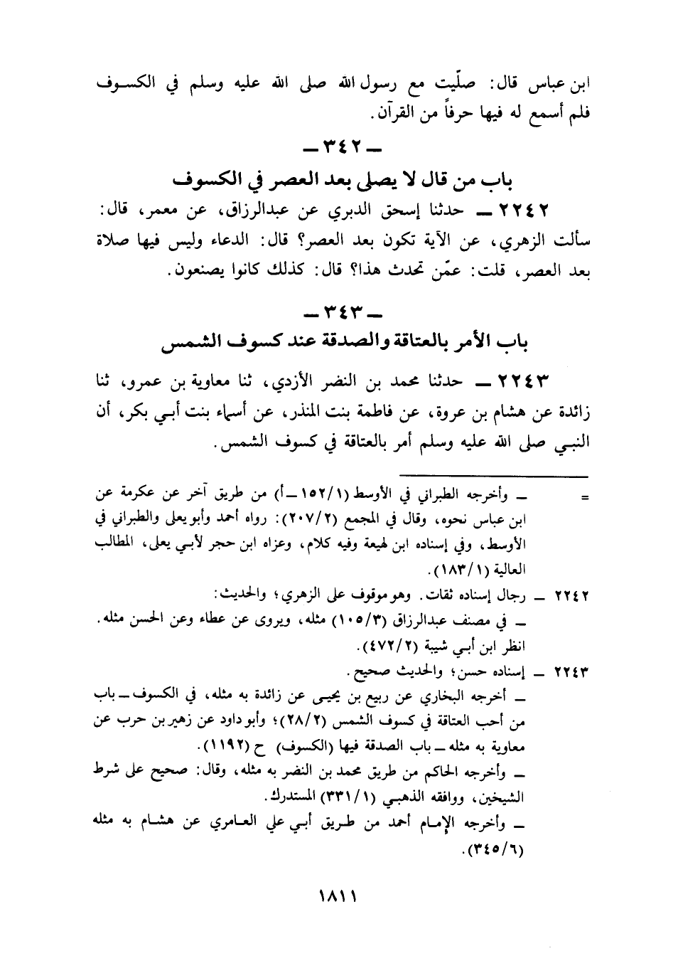 2242- حَدَّثَنَا إِسْحَاقُ الدَّبَرِيُّ، عَنْ عَبْدِ الرَّزَّاقِ، عَنْ مَعْمَرٍ، قَالَ: سَأَلْتُ الزُّهْرِيَّ عَنِ الآيَةِ تَكُونُ بَعْدَ الْعَصْرِ, قَالَ: الدُّعَاءُ وَلَيْسَ فِيهَا صَلاَةٌ بَعْدَ الْعَصْرِ, قُلْتُ: عَمَّنْ تُحَدِّثُ هَذَا؟ قَالَ: كَذَلِكَ كَانُوا يَصْنَعُونَ.