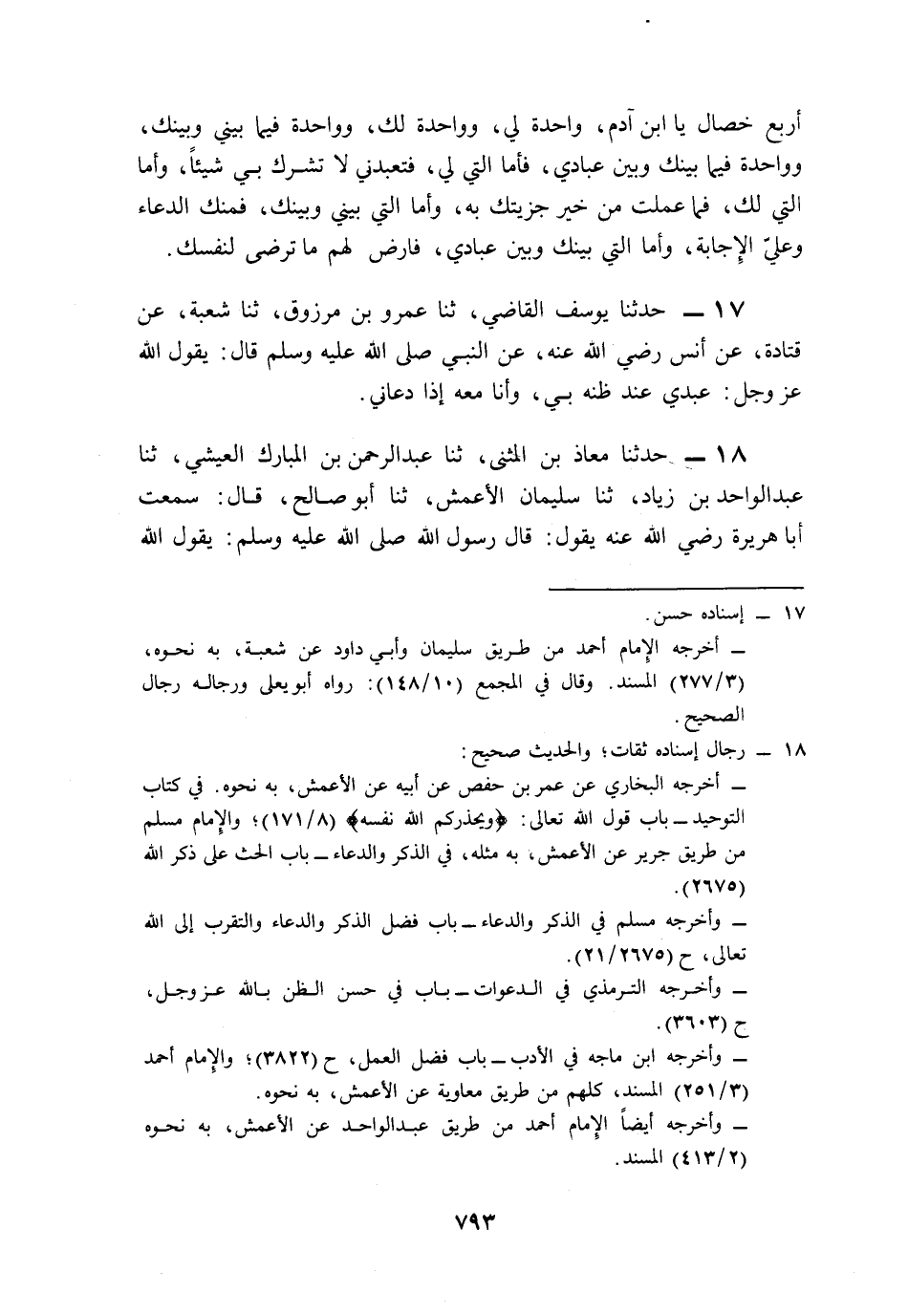 18- حَدَّثَنَا مُعَاذُ بْنُ الْمُثَنَّى، حَدَّثَنَا عَبْدُ الرَّحْمَنِ بْنُ الْمُبَارَكِ الْعَيْشِيُّ، حَدَّثَنَا عَبْدُ الْوَاحِدِ بْنُ زِيَادٍ، حَدَّثَنَا سُلَيْمَانُ الأَعْمَشُ، حَدَّثَنَا أَبُو صَالِحٍ، قَالَ: سَمِعْتُ أَبَا هُرَيْرَةَ، رَضِيَ اللَّهُ عَنْهُ يَقُولُ: قَالَ رَسُولُ اللهِ صَلى الله عَلَيه وَسَلم: يَقُولُ اللَّهُ عَزَّ وَجَلَّ: أَنَا عِنْدَ ظَنِّ عَبْدِي بِي, وَأَنَا مَعَهُ حِينَ يَدْعُونِي، إِنْ ذَكَرَنِي فِي نَفْسِهِ, ذَكَرْتُهُ فِي نَفْسِي، وَإِنْ ذَكَرَنِي فِي مَلأٍ, ذَكَرْتُهُ فِي مَلأٍ خَيْرًا مِنْهُمْ، وَإِنْ تَقَرَّبَ إِلَيَّ شِبْرًا, تَقَرَّبْتُ إِلَيْهِ ذِرَاعًا، وَإِنْ تَقَرَّبَ إِلَيَّ ذِرَاعًا, تَقَرَّبْتُ إِلَيْهِ بَاعًا، وَإِنْ جَاءَنِي يَمْشِي, جِئْتُهُ مُهَرْوِلاً.