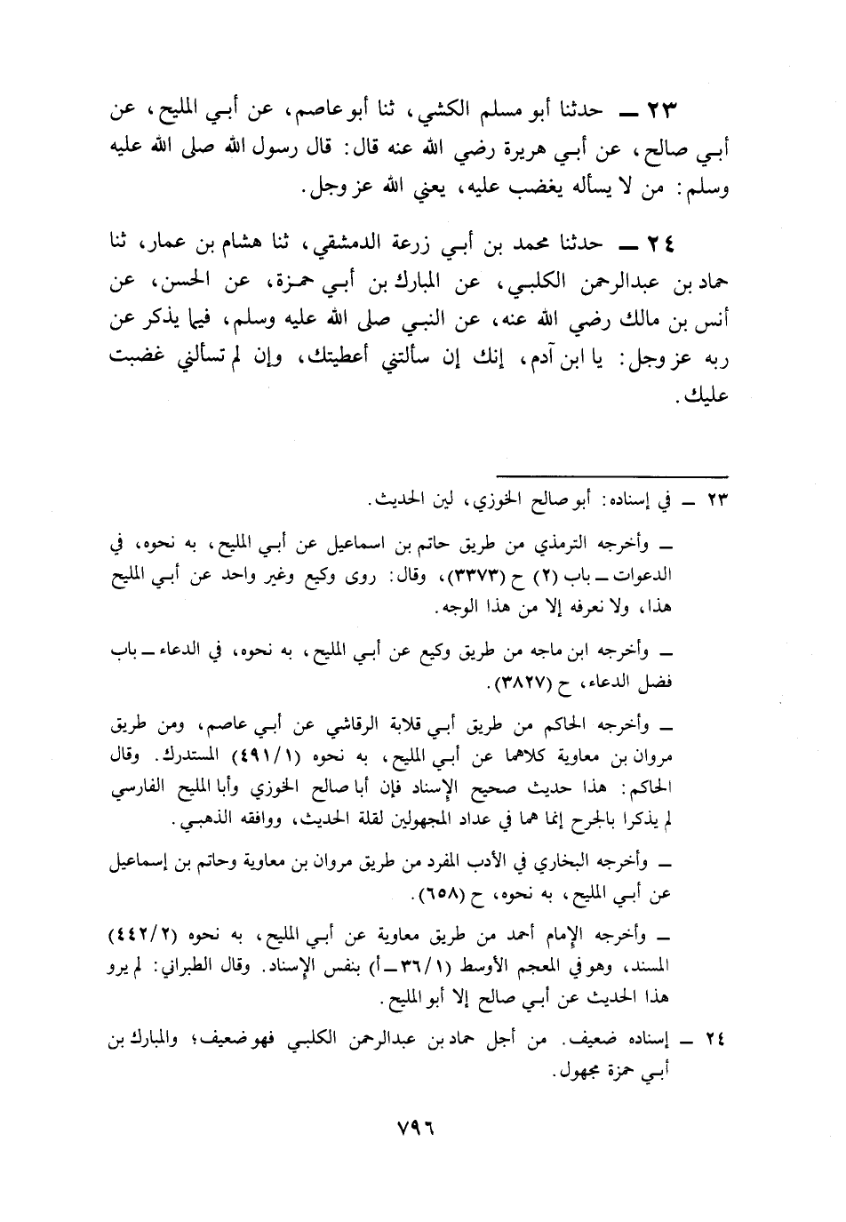23- حَدَّثَنَا أَبُو مُسْلِمٍ الْكَشِّيُّ، حَدَّثَنَا أَبُو عَاصِمٍ، عَنْ أَبِي الْمَلِيحِ، عَنْ أَبِي صَالِحٍ، عَنْ أَبِي هُرَيْرَةَ، رَضِيَ اللَّهُ عَنْهُ قَالَ: قَالَ رَسُولُ اللهِ صَلى الله عَلَيه وَسَلم: مَنْ لاَ يَسْأَلْهُ يَغْضَبْ عَلَيْهِ, يَعْنِي اللَّهَ عَزَّ وَجَلَّ.