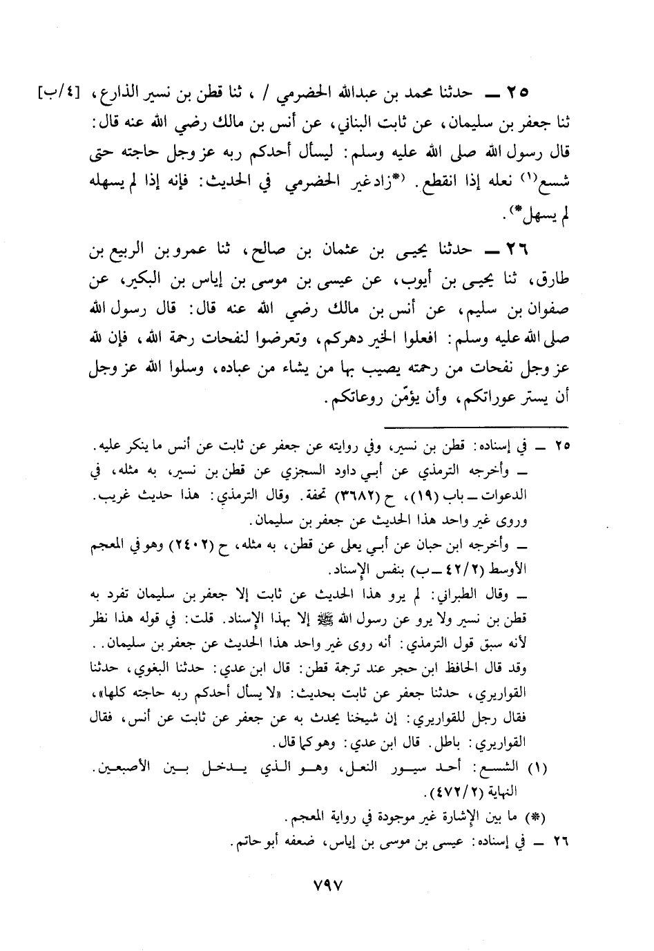 25- حَدَّثَنَا مُحَمَّدُ بْنُ عَبْدِ اللهِ الْحَضْرَمِيُّ، حَدَّثَنَا قَطَنُ بْنُ نُسَيْرٍ الذَّارِعُ، حَدَّثَنَا جَعْفَرُ بْنُ سُلَيْمَانَ، عَنْ ثَابِتٍ الْبُنَانِيِّ، عَنْ أَنَسِ بْنِ مَالِكٍ، رَضِيَ اللَّهُ عَنْهُ قَالَ: قَالَ رَسُولُ اللهِ صَلى الله عَلَيه وَسَلم: لِيَسْأَلْ أَحَدُكُمْ رَبَّهُ عَزَّ وَجَلَّ حَاجَتَهُ, حَتَّى شِسْعَ نَعْلِهِ إِذَا انْقَطَعَ, زَادَ غَيْرُ الْحَضْرَمِيِّ فِي الْحَدِيثِ: فَإِنَّهُ إِذَا لَمْ يُسَهِّلْهُ لَمْ يُسَهَّلْ.