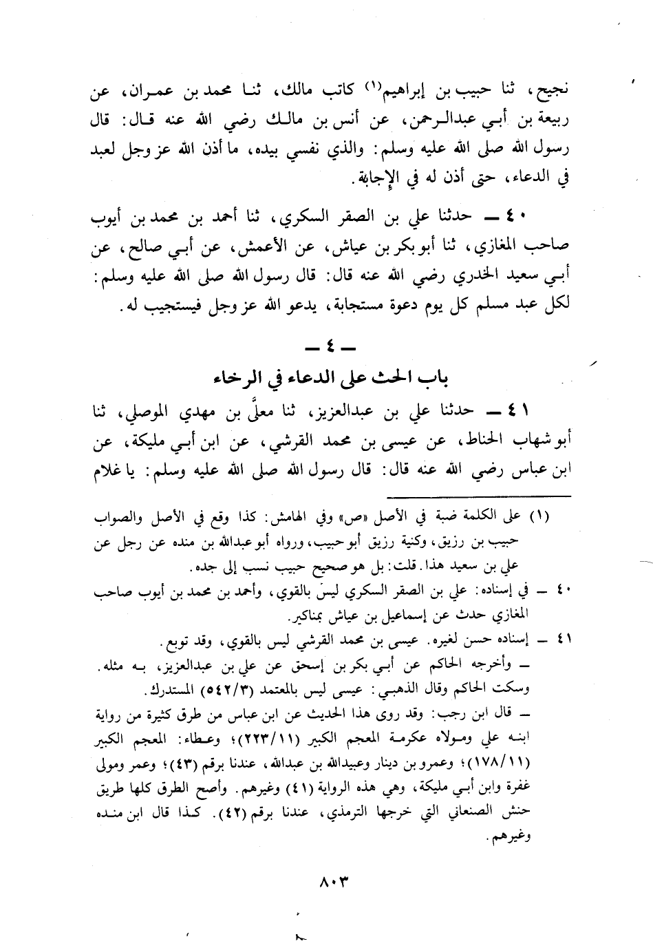 41- حَدَّثَنَا عَلِيُّ بْنُ عَبْدِ الْعَزِيزِ، حَدَّثَنَا مُعَلَّى بْنُ مَهْدِيٍّ الْمَوْصِلِيُّ، حدثَنَا أَبُو شِهَابٍ الْحَنَّاطُ، عَنْ عِيسَى بْنِ مُحَمَّدٍ الْقُرَشِيُّ، عَنِ ابْنِ أَبِي مُلَيْكَةَ، عَنِ ابْنِ عَبَّاسٍ، رَضِيَ اللَّهُ عَنْهُ قَالَ: قَالَ رَسُولُ اللهِ صَلى الله عَلَيه وَسَلم: يَا غُلاَمُ، احْفَظِ اللَّهَ عَزَّ وَجَلَّ يَحْفَظْكَ، احْفَظِ اللَّهَ تَجِدْهُ أَمَامَكَ، تَعَرَّفْ إِلَى اللهِ عَزَّ وَجَلَّ فِي الرَّخَاءِ, يَعْرِفْكَ فِي الشِّدَّةِ، وَاعْلَمْ أَنَّ مَا أَصَابَكَ لَمْ يَكُنْ لِيُخْطِئَكَ، وَمَا أَخْطَأَكَ لَمْ يَكُنْ لِيُصِيبَكَ، وَاعْلَمْ أَنَّ الْخَلاَئِقَ لَوِ اجْتَمَعُوا عَلَى أَنَ يُعْطُوكَ شَيْئًا لَمْ يُرِدِ اللَّهُ عَزَّ وَجَلَّ أَنْ يُعْطِيَكَ لَمْ يَقْدِرُوا عَلَيْهِ، أَوْ يَصْرِفُوا عَنْكَ شَيْئًا أَرَادَ اللَّهُ عَزَّ وَجَلَّ أَنْ يُصِيبَكَ بِهِ لَمْ يَقْدِرُوا عَلَى ذَلِكَ، فَإِذَا سَأَلْتَ فَاسْأَلِ اللَّهَ عَزَّ وَجَلَّ، وَإِذَا اسْتَعَنْتَ فَاسْتَعِنْ بِاللهِ عَزَّ وَجَلَّ، وَاعْلَمْ أَنَّ النَّصْرَ مَعَ الصَّبْرِ، وَاعْلَمْ أَنَّ الْفَرَجَ مَعَ الْكَرْبِ، وَأَنَّ مَعَ الْعُسْرِ يَسِّرَا، وَاعْلَمْ أَنَّ الْقَلَمَ قَدْ جَرَى بِمَا هُوَ كَائِنٌ.