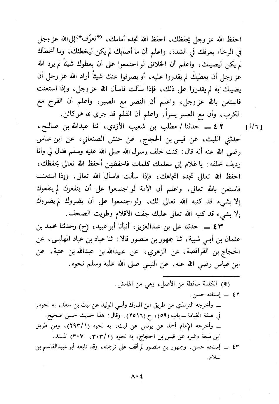 42- حَدَّثَنَا مُطَّلِبُ بْنُ شُعَيْبٍ الأَزْدِيُّ، حَدَّثَنَا عَبْدُ اللهِ بْنُ صَالِحٍ، حَدَّثَنِي اللَّيْثُ، عَنْ قَيْسِ بْنِ الْحَجَّاجِ، عَنْ حَنَشٍ الصَّنْعَانِيِّ، عَنِ ابْنِ عَبَّاسٍ، رَضِيَ اللَّهُ عَنْهُ, أَنَّهُ قَالَ: كُنْتُ خَلْفَ رَسُولَ اللهِ صَلى الله عَلَيه وَسَلم, فَقَالَ لِي وَأَنَا رَدِيفٌ خَلْفَهُ: يَا غُلاَمُ، إِنِّي مُعَلِّمُكَ كَلِمَاتٍ فَاحْفَظْهُنَّ، احْفَظِ اللَّهَ تَعَالَى يَحْفَظْكَ، احْفَظِ اللَّهَ تَعَالَى تَجِدْهُ اتِّجَاهَكَ، فَإِذَا سَأَلْتَ فَاسْأَلِ اللَّهَ تَعَالَى، وَإِذَا اسْتَعَنْتَ فَاسْتَعِنْ بِاللهِ تَعَالَى، وَاعْلَمْ أَنَّ الأُمَّةَ لَوِ اجْتَمَعُوا عَلَى أَنْ يَنْفَعُوكَ لَمْ يَنْفَعُوكَ إِلاَّ بِشَيْءٍ قَدْ كَتَبَهُ اللَّهُ تَعَالَى لَكَ، وَلَوِ اجْتَمَعُوا عَلَى أَنْ يَضُرُّوكَ لَمْ يَضُرُّوكَ إِلاَّ بِشَيْءٍ قَدْ كَتَبَهُ اللَّهُ تَعَالَى عَلَيْكَ، جَفَّتِ الأَقْلاَمُ، وَطُوِيَتِ الصُّحُفُ.