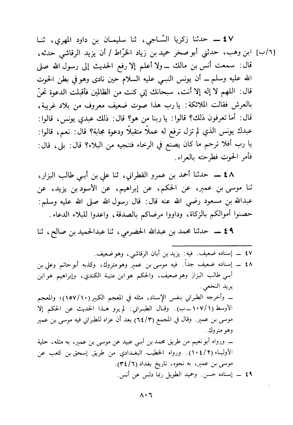 47- حَدَّثَنَا زَكَرِيَّا السَّاجِيُّ، حَدَّثَنَا سُلَيْمَانُ بْنُ دَاوُدَ الْمَهْرِيُّ، حَدَّثَنَا ابْنُ وَهْبٍ، حَدَّثَنِي أَبُو صَخْرٍ حُمَيْدُ بْنُ زِيَادٍ الْخَرَّاطُ، أَنَّ يَزِيدَ الرَّقَاشِيَّ حَدَّثَهُ قَالَ: سَمِعْتُ أَنَسَ بْنَ مَالِكٍ، وَلاَ أَعْلَمُ إِلاَّ رَفَعَ الْحَدِيثَ إِلَى رَسُولِ اللهِ صَلى الله عَلَيه وَسَلم: أَنَّ يُونُسَ النَّبِيَّ عَلَيْهِ السَّلاَمُ حِينَ نَادَى وَهُوَ فِي بَطْنِ الْحُوتِ, قَالَ: اللَّهُمَّ لاَ إِلَهَ إِلاَّ أَنْتَ سُبْحَانَكَ إِنِّي كُنْتُ مِنَ الظَّالِمِينَ، فَأَقْبَلَتِ الدَّعْوَةُ تَحِنُّ بِالْعَرْشِ, فَقَالَتِ الْمَلاَئِكَةُ: يَا رَبِّ, هَذَا صَوْتُ ضَعِيفٍ مَعْرُوفٍ مِنْ بِلاَدٍ غَرِيبَةٍ، قَالَ: أَمَا تَعْرِفُونَ ذَلِكَ؟ قَالُوا: يَا رَبَّنَا مَنْ هُوَ؟ قَالَ: ذَلِكَ عَبْدِي يُونُسُ، قَالُوا: عَبْدُكَ يُونُسُ الَّذِي لَمْ تَزَلْ تَرْفَعُ لَهُ عَمَلاً مُتَقَبَّلاً وَدَعْوَةً مُجَابَةً؟ قَالَ: نَعَمْ، قَالُوا: يَا رَبُّ, أَفَلاَ تَرْحَمُ مَا كَانَ يَصْنَعُ فِي الرَّخَاءِ فَتُنْجِيهِ مِنَ الْبَلاَءِ؟ قَالَ: بَلَى، قَالَ: فَأَمَرَ الْحُوتَ فَطَرَحَتْهُ بِالْعَرَاءِ.