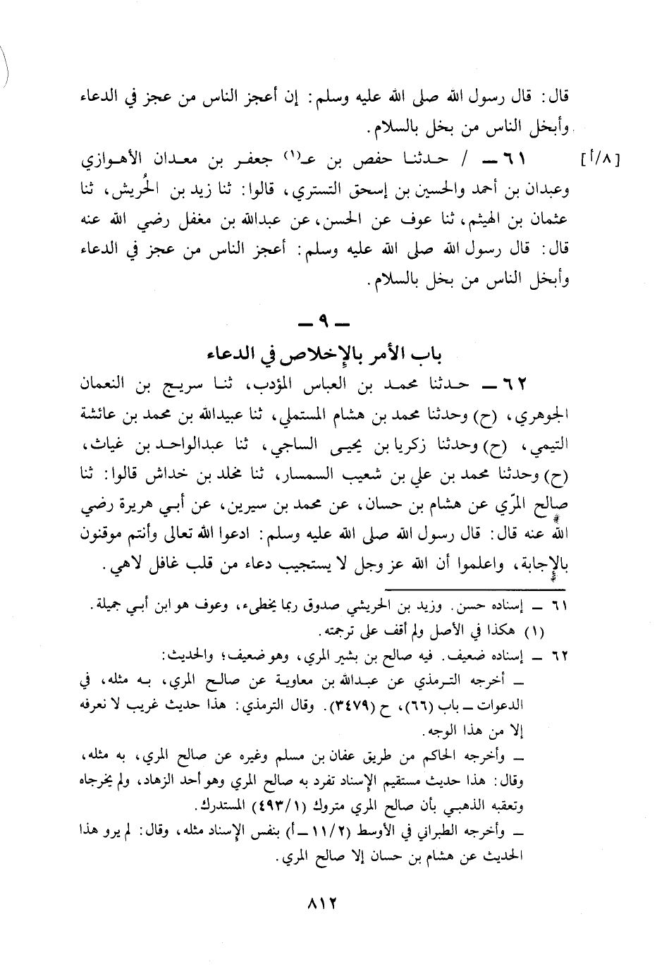 61- حَدَّثَنَا جَعْفَرُ بْنُ مَعْدَانَ (1) الأَهْوَازِيُّ، وَعَبْدَانُ بْنُ أَحْمَدَ، وَالْحُسَيْنُ بْنُ إِسْحَاقَ التُّسْتَرِيُّ، قَالُوا: حَدَّثَنَا زَيْدُ بْنُ الْحَرِيشِ، حَدَّثَنَا عُثْمَانُ بْنُ الْهَيْثَمِ، حَدَّثَنَا عَوْفٌ، عَنِ الْحَسَنِ، عَنْ عَبْدِ اللهِ بْنِ مُغَفَّلٍ، رَضِيَ اللَّهُ عَنْهُ قَالَ: قَالَ رَسُولُ اللهِ صَلى الله عَلَيه وَسَلم: أَعْجَزُ النَّاسِ مَنْ عَجَزَ فِي الدُّعَاءِ، وَأَبْخَلُ النَّاسِ مَنْ بَخِلَ بِالسَّلاَمِ.