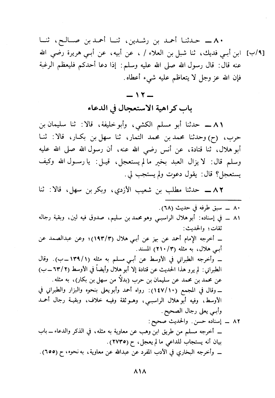 82- حَدَّثَنَا مُطَّلِبُ بْنُ شُعَيْبٍ الأَزْدِيُّ، وَبَكْرُ بْنُ سَهْلٍ، قَالاَ: حَدَّثَنَا عَبْدُ اللهِ بْنُ صَالِحٍ، حَدَّثَنِي مُعَاوِيَةُ بْنُ صَالِحٍ، عَنْ رَبِيعَةَ بْنِ يَزِيدَ، عَنْ أَبِي إِدْرِيسَ الْخَوْلاَنِيِّ، عَنْ أَبِي هُرَيْرَةَ، رَضِيَ اللَّهُ عَنْهُ, عَنْ رَسُولِ اللهِ صَلى الله عَلَيه وَسَلم قَالَ: يُسْتَجَابُ لِأَحَدِكُمْ مَا لَمْ يَدْعُ بِإِثْمٍ أَوْ قَطِيعَةِ رَحِمٍ أَوْ يَسْتَعْجِلْ, قَالُوا: وَمَا الِاسْتِعْجَالُ يَا رَسُولَ اللهِ؟ قَالَ: يَقُولُ: قَدْ دَعَوْتُكَ فَلاَ أَرَاكَ تَسْتَجِيبُ لِي, فَيَسْتَحْسِرُ عِنْدَ ذَلِكَ, فَيَدَعُ الدُّعَاءَ.