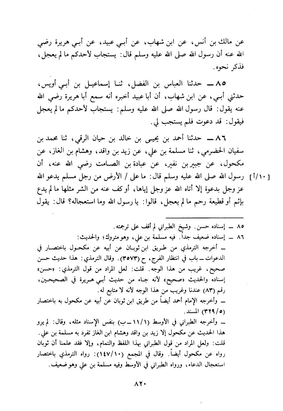 86- حَدَّثَنَا أَحْمَدُ بْنُ يَحْيَى بْنِ خَالِدِ بْنِ حَيَّانَ الرَّقِّيُّ، حَدَّثَنَا مُحَمَّدُ بْنُ سُفْيَانَ الْحَضْرَمِيُّ، حَدَّثَنَا مَسْلَمَةُ بْنُ عُلَيٍّ (1)، عَنْ زَيْدِ بْنِ وَاقِدٍ، وَهِشَامِ بْنِ الْغَازِ، عَنْ مَكْحُولٍ، عَنْ جُبَيْرِ بْنِ نُفَيْرٍ، عَنْ عُبَادَةَ بْنِ الصَّامِتِ، رَضِيَ اللَّهُ عَنْهُ, أَنَّ رَسُولَ اللهِ صَلى الله عَلَيه وَسَلم قَالَ: مَا عَلَى الأَرْضِ مِنْ رَجُلٍ مُسْلِمٍ يَدْعُو اللَّهَ عَزَّ وَجَلَّ بِدَعْوَةٍ إِلاَّ أَتَاهُ اللَّهُ عَزَّ وَجَلَّ إِيَّاهَا, أَوْ كَفَّ عَنْهُ مِنَ الشَّرِّ مِثْلَهَا, مَا لَمْ يَدْعُ بِإِثْمٍ أَوْ قَطِيعَةِ رَحِمٍ مَا لَمْ يَعْجَلْ, قَالُوا: يَا رَسُولَ اللهِ, وَمَا اسْتِعْجَالُهُ؟ قَالَ: يَقُولُ: قَدْ دَعَوْتُ وَدَعَوْتُ فَلَمْ يُسْتَجَبْ لِي, فَقَالَ رَجُلٌ مِنَ الْقَوْمِ: إِذًا نُكْثِرُ يَا رَسُولَ اللهِ، قَالَ: اللَّهُ عَزَّ وَجَلَّ أَكْثَرُ.