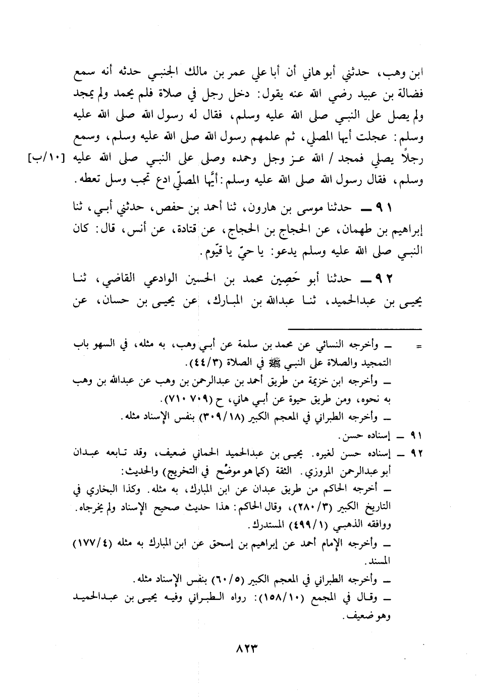 91- حَدَّثَنَا مُوسَى بْنُ هَارُونَ، حَدَّثَنَا أَحْمَدُ بْنُ حَفْصٍ، حَدَّثَنِي أَبِي، حَدَّثَنَا إِبْرَاهِيمُ بْنُ طَهْمَانَ، عَنِ الْحَجَّاجِ بْنِ الْحَجَّاجِ، عَنْ قَتَادَةَ، عَنْ أَنَسٍ، قَالَ: كَانَ النَّبِيُّ صَلى الله عَلَيه وَسَلم يَدْعُو: يَا حَيُّ يَا قَيُّومُ.