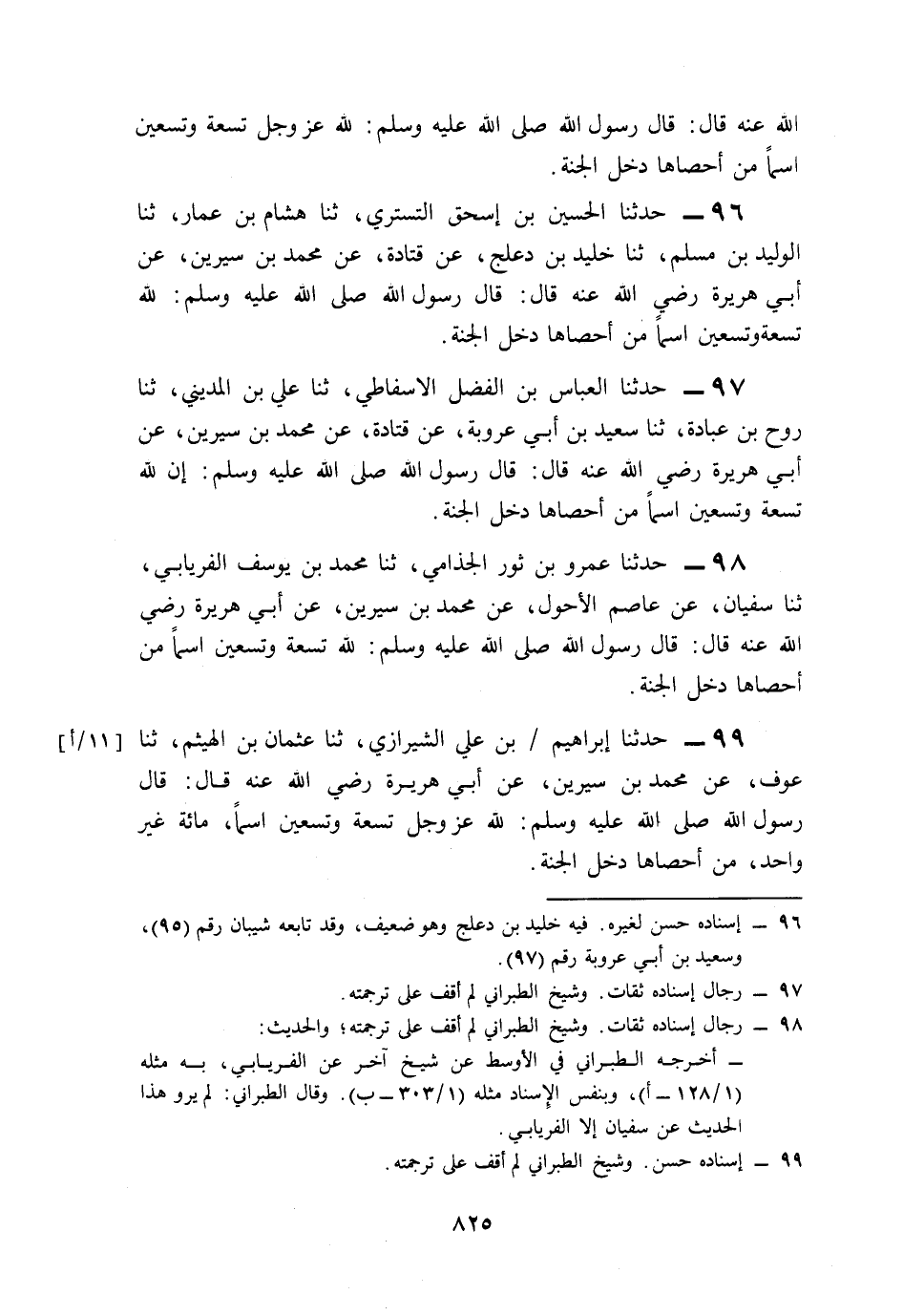 96- حَدَّثَنَا الْحُسَيْنُ بْنُ إِسْحَاقَ التُّسْتَرِيُّ، حَدَّثَنَا هِشَامُ بْنُ عَمَّارٍ، حَدَّثَنَا الْوَلِيدُ بْنُ مُسْلِمٍ، حَدَّثَنَا خُلَيْدُ بْنُ دَعْلَجٍ، عَنْ قَتَادَةَ، عَنْ مُحَمَّدِ بْنِ سِيرِينَ، عَنْ أَبِي هُرَيْرَةَ، رَضِيَ اللَّهُ عَنْهُ قَالَ: قَالَ رَسُولُ اللهِ صَلى الله عَلَيه وَسَلم: لِلَّهِ تِسْعَة وَتِسْعِينَ اسْمًا، مَنْ أَحْصَاهَا دَخَلَ الْجَنَّةَ.