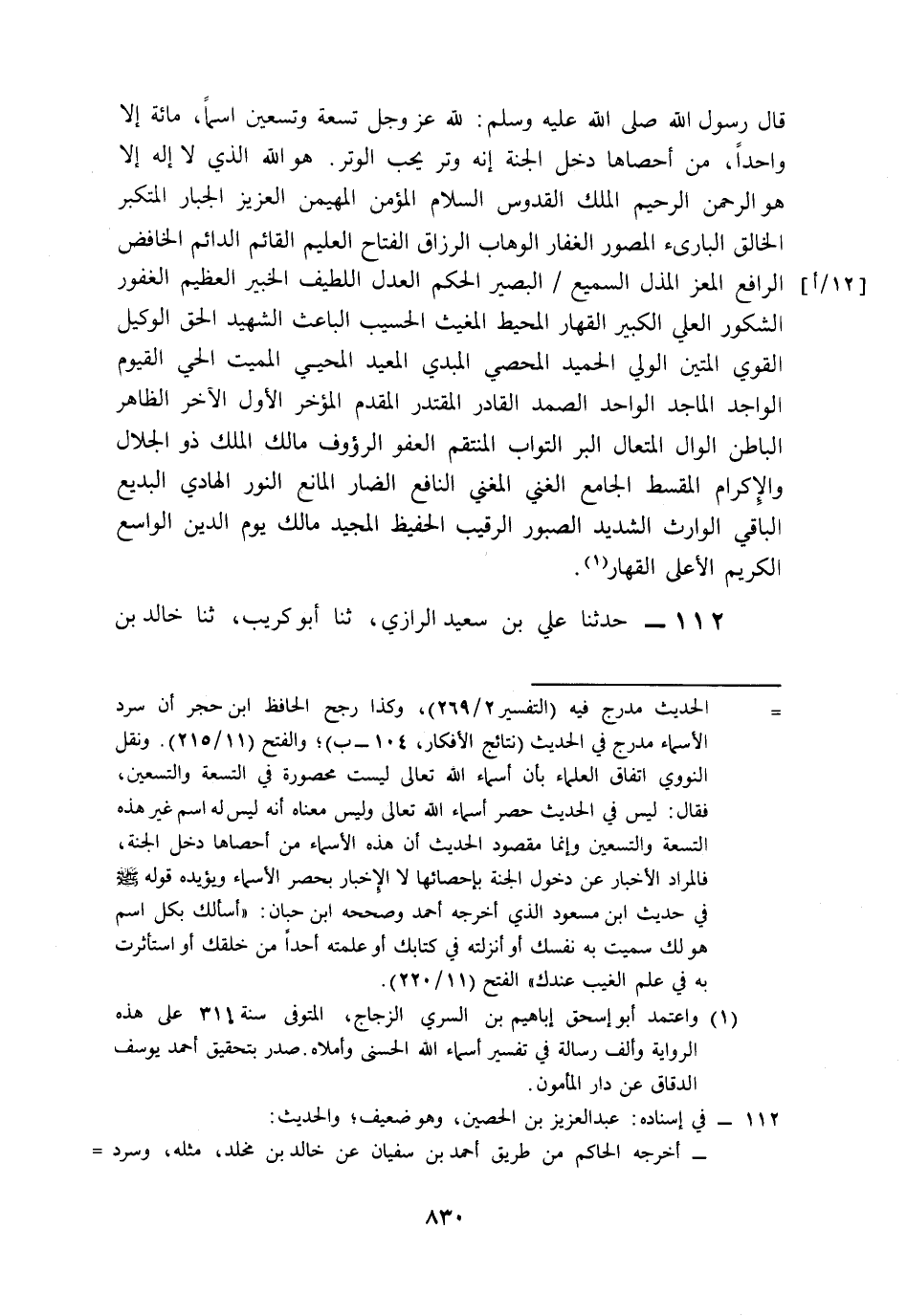 112- حَدَّثَنَا عَلِيُّ بْنُ سَعِيدٍ الرَّازِيُّ، حَدَّثَنَا أَبُو كُرَيْبٍ، حَدَّثَنَا خَالِدُ بْنُ مَخْلَدٍ، حَدَّثَنَا عَبْدُ الْعَزِيزِ بْنُ الْحُصَيْنِ، عَنْ أَيُّوبَ السَّخْتِيَانِيِّ، عَنْ مُحَمَّدِ بْنِ سِيرِينَ، عَنْ أَبِي هُرَيْرَةَ، رَضِيَ اللَّهُ عَنْهُ قَالَ: قَالَ رَسُولُ اللهِ صَلى الله عَلَيه وَسَلم: لِلَّهِ عَزَّ وَجَلَّ تِسْعَة وَتِسْعِينَ اسْمًا, مَنْ أَحْصَاهَا دَخَلَ الْجَنَّةَ, ثُمَّ ذَكَرَ الأَسْمَاءَ نَحْوَ مَا ذَكَرَهَا الْوَلِيدُ, عَنْ شُعَيْبِ بْنِ أَبِي حَمْزَةَ.