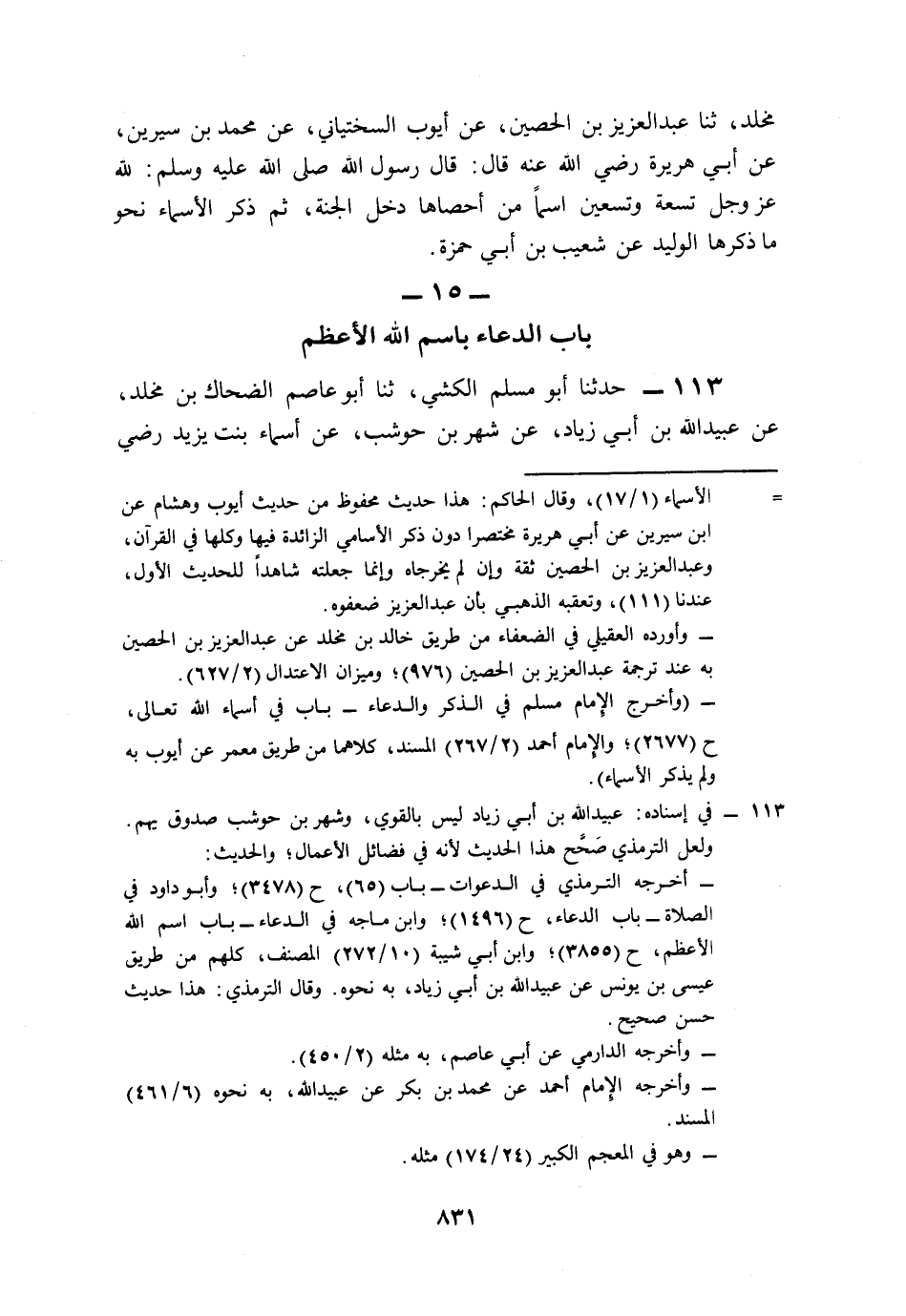 113- حَدَّثَنَا أَبُو مُسْلِمٍ الْكَشِّيُّ، حَدَّثَنَا أَبُو عَاصِمٍ الضَّحَّاكُ بْنُ مَخْلَدٍ، عَنْ عُبَيْدِ اللهِ بْنُ أَبِي زِيَادٍ، عَنْ شَهْرِ بْنِ حَوْشَبٍ، عَنْ أَسْمَاءَ بِنْتِ يَزِيدَ، رَضِيَ اللَّهُ عَنْهَا قَالَتْ: قَالَ رَسُولُ صَلى الله عَلَيه وَسَلم: اسْمُ اللهِ الأَعْظَمُ فِي هَاتَيْنِ الآيَتَيْنِ: {الم اللَّهُ لاَ إِلَهَ إِلاَّ هُوَ} {وَإِلَهُكُمْ إِلَهٌ وَاحِدٌ}.