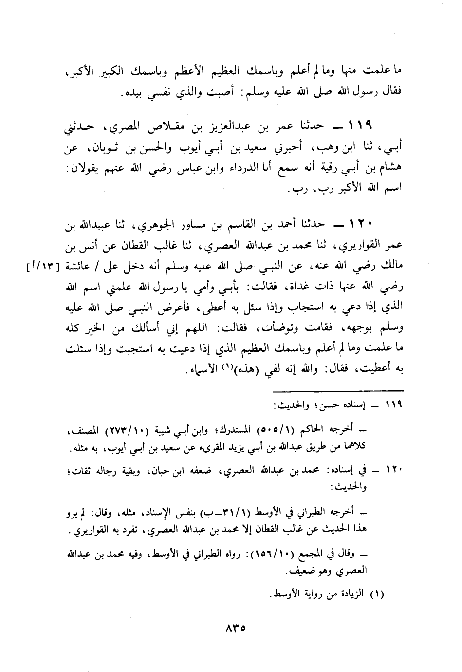 120- حَدَّثَنَا أَحْمَدُ بْنُ الْقَاسِمِ بْنِ مُسَاوِرٍ الْجَوْهَرِيُّ، حَدَّثَنَا عُبَيْدُ اللهِ بْنُ عُمَرَ الْقَوَارِيرِيُّ، حَدَّثَنَا مُحَمَّدُ بْنُ عَبْدِ اللهِ الْعَصَرِيُّ، حدثَنَا غَالِبٌ الْقَطَّانُ، عَنْ أَنَسِ بْنِ مَالِكٍ، رَضِيَ اللَّهُ عَنْهُ, عَنِ النَّبِيِّ صَلى الله عَلَيه وَسَلم, أَنَّهُ دَخَلَ عَلَى عَائِشَةَ رَضِيَ اللَّهُ عَنْهَا ذَاتَ غَدَاةٍ, فَقَالَتْ: بِأَبِي وَأُمِّي يَا رَسُولَ اللهِ, عَلِّمْنِي اسْمَ اللهِ الَّذِي إِذَا دُعِيَ بِهِ اسْتَجَابَ، وَإِذَا سُئِلَ بِهِ أَعْطَى، فَأَعْرَضَ النَّبِيُّ صَلى الله عَلَيه وَسَلم بِوَجْهِهِ, فَقَامَتْ وَتَوَضَّأَتْ, فَقَالَتِ: اللَّهُمَّ إِنِّي أَسْأَلُكَ مِنَ الْخَيْرِ كُلِّهِ مَا عَلِمْتُ وَمَا لَمْ أَعْلَمْ، وَبِاسْمِكَ الْعَظِيمِ الَّذِي إِذَا دُعِيتَ بِهِ اسْتَجَبْتَ, وَإِذَا سُئِلَتْ بِهِ أَعْطَيْتَ, فَقَالَ: وَاللهِ إِنَّهُ لَفِي هَذِهِ الأَسْمَاءِ.