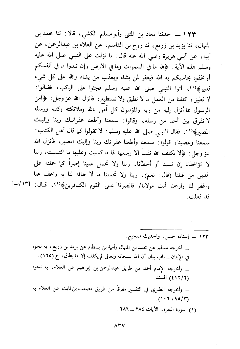 123- حَدَّثَنَا مُعَاذُ بْنُ الْمُثَنَّى، وَأَبُو مُسْلِمٍ الْكَشِّيُّ, قَالاَ: حَدَّثَنَا مُحَمَّدُ بْنُ الْمِنْهَالِ، حَدَّثَنَا يَزِيدُ بْنُ زُرَيْعٍ، حَدَّثَنَا رَوْحُ بْنُ الْقَاسِمِ، عَنِ الْعَلاَءِ بْنِ عَبْدِ الرَّحْمَنِ، عَنْ أَبِيهِ، عَنْ أَبِي هُرَيْرَةَ، رَضِيَ اللَّهُ عَنْهُ قَالَ: لَمَّا نَزَلَتْ عَلَى النَّبِيِّ صَلى الله عَلَيه وَسَلم هَذِهِ الآيَةُ: {لِلَّهِ مَا فِي السَّمَاوَاتِ وَمَا فِي الأَرْضِ وَإِنْ تُبْدُوا مَا فِي أَنْفُسِكُمْ أَوْ تُخْفُوهُ يُحَاسِبْكُمْ بِهِ اللَّهُ فَيَغْفِرُ لِمَنْ يَشَاءُ وَيُعَذِّبُ مَنْ يَشَاءُ وَاللَّهُ عَلَى كُلِّ شَيْءٍ قَدِيرٌ} أَتَوُا النَّبِيَّ صَلى الله عَلَيه وَسَلم, فَجَثَوْا عَلَى الرُّكَبِ، فَقَالُوا: لاَ نُطِيقُ، كُلِّفْنَا مِنَ الْعَمَلِ مَا لاَ نُطِيقُ, وَلاَ نَسْتَطِيعُ،