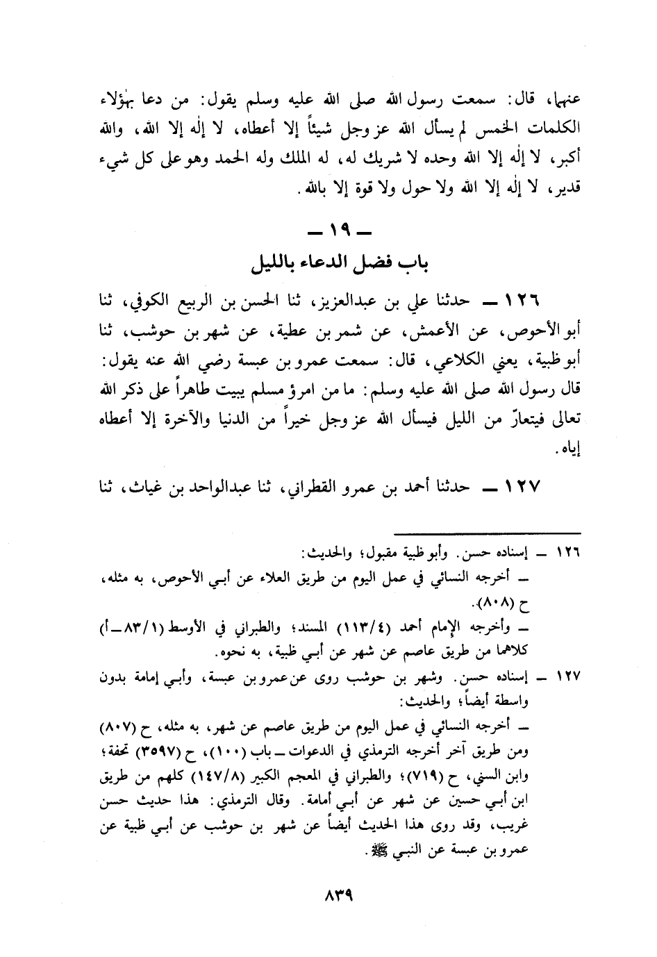 126- حَدَّثَنَا عَلِيُّ بْنُ عَبْدِ الْعَزِيزِ، حَدَّثَنَا الْحَسَنُ بْنُ الرَّبِيعِ الْكُوفِيُّ، حَدَّثَنَا أَبُو الأَحْوَصِ، عَنِ الأَعْمَشِ، عَنْ شِمْرِ بْنِ عَطِيَّةَ، عَنْ شَهْرِ بْنِ حَوْشَبٍ، حَدَّثَنَا أَبُو ظَبْيَةَ, يَعْنِي الْكَلاَعِيَّ، قَالَ: سَمِعْتُ عَمْرَو بْنَ عَبَسَةَ، رَضِيَ اللَّهُ عَنْهُ يَقُولُ: قَالَ رَسُولُ اللهِ صَلى الله عَلَيه وَسَلم: مَا مِنَ امْرِئٍ مُسْلِمٍ يَبِيتُ طَاهِرًا عَلَى ذِكْرِ اللهِ تَعَالَى, فَيَتَعَارُّ مِنَ اللَّيْلِ فَيَسْأَلُ اللَّهَ عَزَّ وَجَلَّ خَيْرًا مِنَ الدُّنْيَا وَالآخِرَةِ إِلاَّ أَعْطَاهُ إِيَّاهُ.
