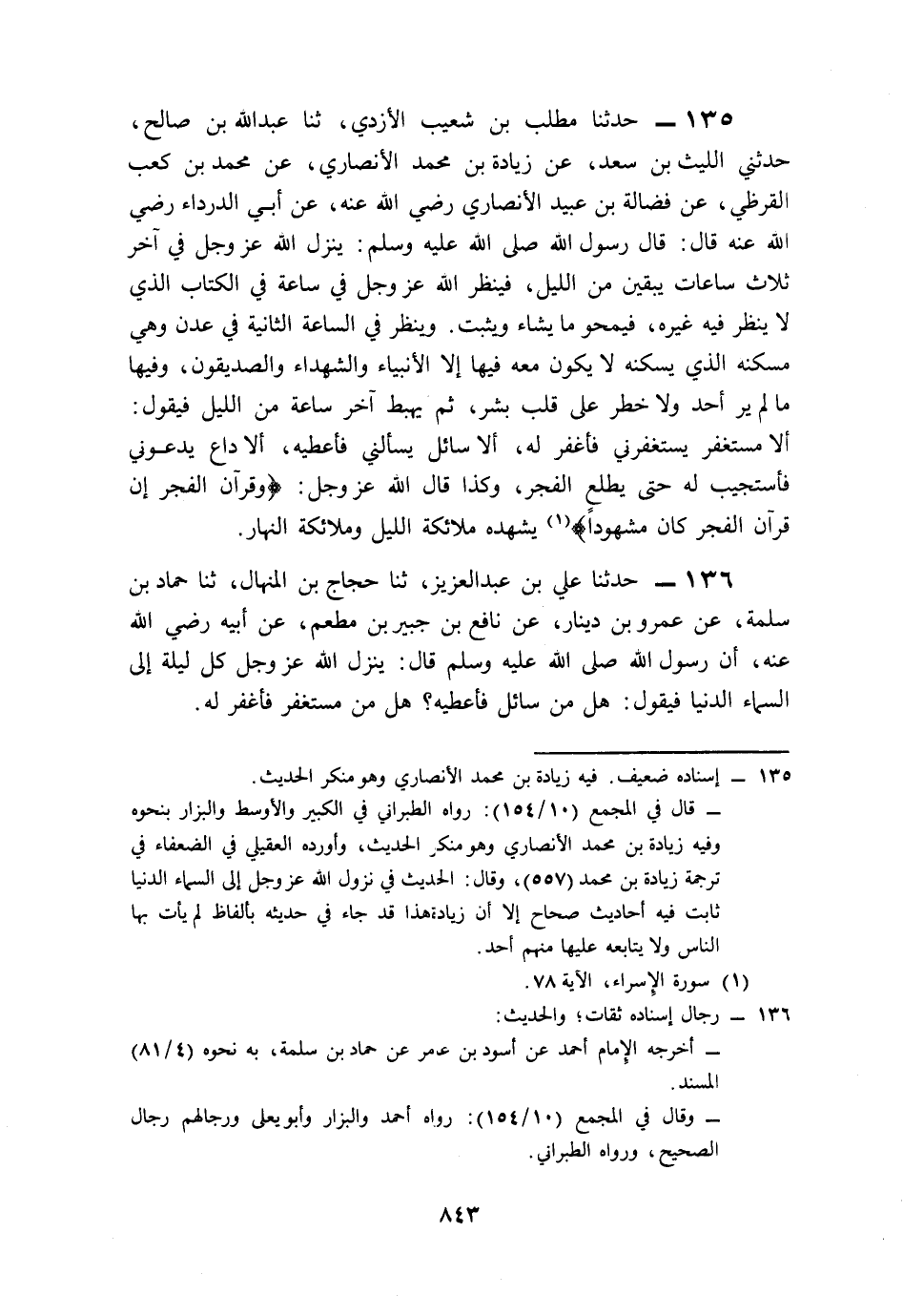 135- حَدَّثَنَا مُطَّلِبُ بْنُ شُعَيْبٍ الأَزْدِيُّ، حَدَّثَنَا عَبْدُ اللهِ بْنُ صَالِحٍ، حَدَّثَنِي اللَّيْثُ بْنُ سَعْدٍ، عَنْ زِيَادَةَ بْنِ مُحَمَّدٍ الأَنْصَارِيِّ، عَنْ مُحَمَّدِ بْنِ كَعْبٍ الْقُرَظِيِّ، عَنْ فَضَالَةَ بْنِ عُبَيْدٍ الأَنْصَارِيِّ، رَضِيَ اللَّهُ عَنْهُ, عَنْ أَبِي الدَّرْدَاءِ، رَضِيَ اللَّهُ عَنْهُ قَالَ: قَالَ رَسُولُ اللهِ صَلى الله عَلَيه وَسَلم: يَنْزِلُ اللَّهُ عَزَّ وَجَلَّ فِي آخِرِ ثَلاَثِ سَاعَاتٍ يَبْقَيْنَ مِنَ اللَّيْلِ, فَيَنْظُرُ اللَّهُ عَزَّ وَجَلَّ فِي سَاعَةٍ فِي الْكِتَابِ الَّذِي لاَ يَنْظُرُ فِيهِ غَيْرُهُ، فَيَمْحُو مَا يَشَاءُ وَيُثْبِتُ, وَيَنْظُرُ فِي السَّاعَةِ الثَّانِيَةِ فِي عَدْنَ, وَهِيَ مَسْكَنُهُ الَّذِي يَسْكُنُهُ لاَ يَكُونُ مَعَهُ فِيهَا إِلاَّ الأَنْبِيَاءُ وَالشُّهَدَاءُ وَالصِّدِّيقُونَ, وَفِيهَا مَا لَمْ يَرَ أَحَدٌ, وَلاَ خَطَرَ عَلَى قَلْبِ بِشْرٍ, ثُمَّ يَهْبِطُ آخِرَ سَاعَةٍ مِنَ اللَّيْلِ فَيَقُولُ: أَلاَ مُسْتَغْفِرٌ يَسْتَغْفِرُنِي فَأَغْفِرَ لَهُ، أَلاَ سَائِلٌ يَسْأَلُنِي فَأُعْطِيَهُ، أَلاَ دَاعٍ يَدْعُونِي, فَأَسْتَجِيبَ لَهُ، حَتَّى يَطْلُعَ الْفَجْرُ، وَكَذَا قَالَ اللَّهُ عَزَّ وَجَلَّ: {وَقُرْآنَ الْفَجْرِ إِنَّ قُرْآنَ الْفَجْرِ كَانَ مَشْهُودًا} يَشْهَدُهُ مَلاَئِكَةُ اللَّيْلِ, وَمَلاَئِكَةُ النَّهَارِ.