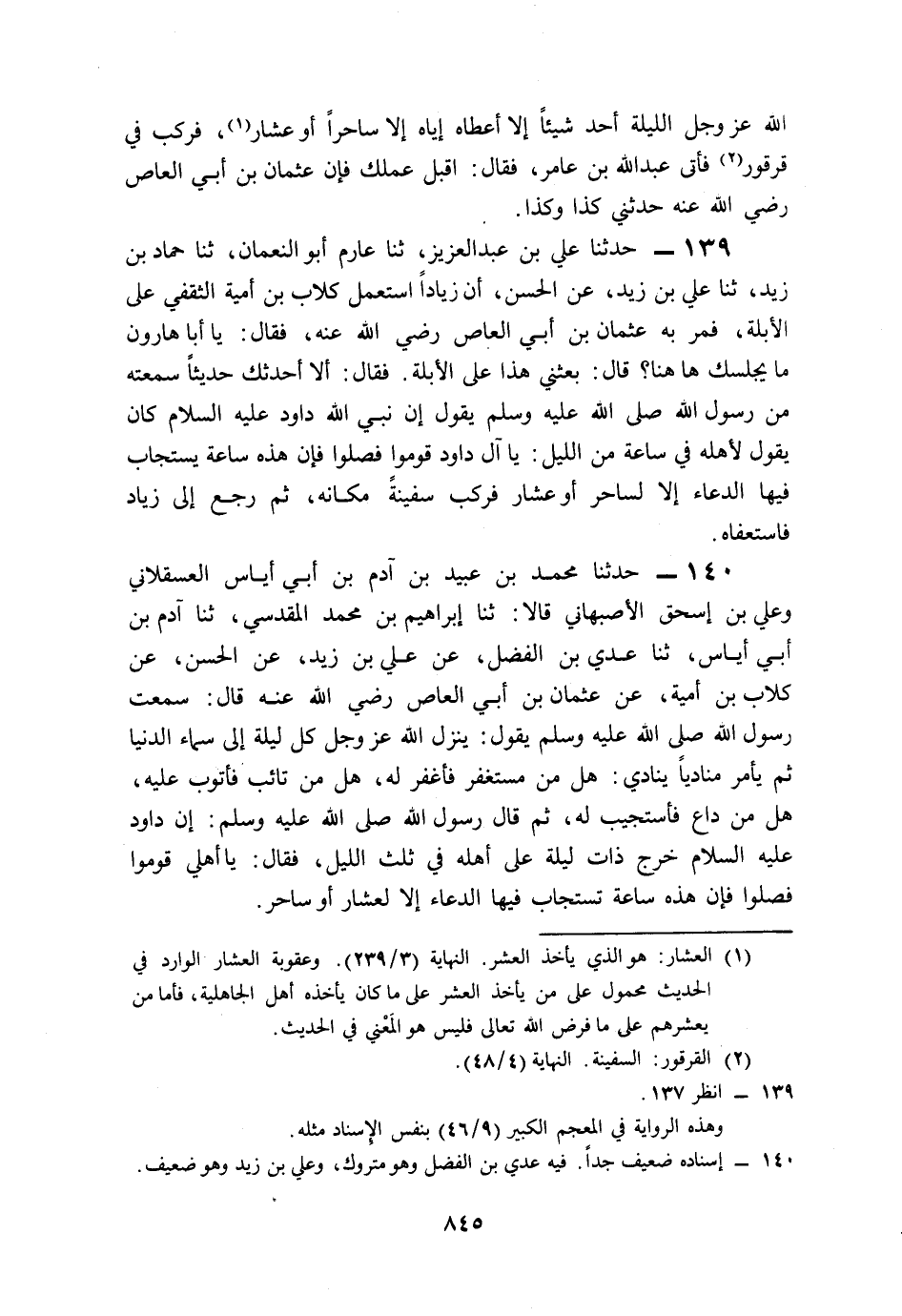140- حَدَّثَنَا مُحَمَّدُ بْنُ عُبَيْدِ بْنِ آدَمَ بْنِ أَبِي إِيَاسَ الْعَسْقَلاَنِيُّ، وَعَلِيُّ بْنُ إِسْحَاقَ الأَصْبَهَانِيُّ، قَالاَ: حَدَّثَنَا إِبْرَاهِيمُ بْنُ مُحَمَّدٍ الْمَقْدِسِيُّ، حَدَّثَنَا آدَمُ بْنُ أَبِي إِيَاسَ، حَدَّثَنَا عَدِيُّ بْنُ الْفَضْلِ، عَنْ عَلِيِّ بْنِ زَيْدٍ، عَنِ الْحَسَنِ، عَنْ كِلاَبِ بْنِ أُمَيَّةَ، عَنْ عُثْمَانَ بْنِ أَبِي الْعَاصِ، رَضِيَ اللَّهُ عَنْهُ قَالَ: سَمِعْتُ رَسُولَ اللهِ صَلى الله عَلَيه وَسَلم يَقُولُ: يَنْزِلُ اللَّهُ عَزَّ وَجَلَّ كُلَّ لَيْلَةٍ إِلَى سَمَاءِ الدُّنْيَا, ثُمَّ يَأْمُرُ مُنَادِيًا يُنَادِي: هَلْ مِنْ مُسْتَغْفِرِ فَأَغْفِرَ لَهُ، هَلْ مِنْ تَائِبٍ فَأَتُوبَ عَلَيْهِ، هَلْ مِنْ دَاعِ فَأَسْتَجِيبَ لَهُ, ثُمَّ قَالَ رَسُولُ اللهِ صَلى الله عَلَيه وَسَلم: إِنَّ دَاوُدَ عَلَيْهِ السَّلاَمُ خَرَجَ ذَاتَ لَيْلَةٍ عَلَى أَهْلِهِ فِي ثُلُثِ اللَّيْلِ, فَقَالَ: يَا أَهْلِي, قُومُوا فَصَلُّوا، فَإِنَّ هَذِهِ سَاعَةٌ يُسْتَجَابُ فِيهَا الدُّعَاءُ إِلاَّ لِعَشَّارٍ, أَوْ سَاحِرٍ.