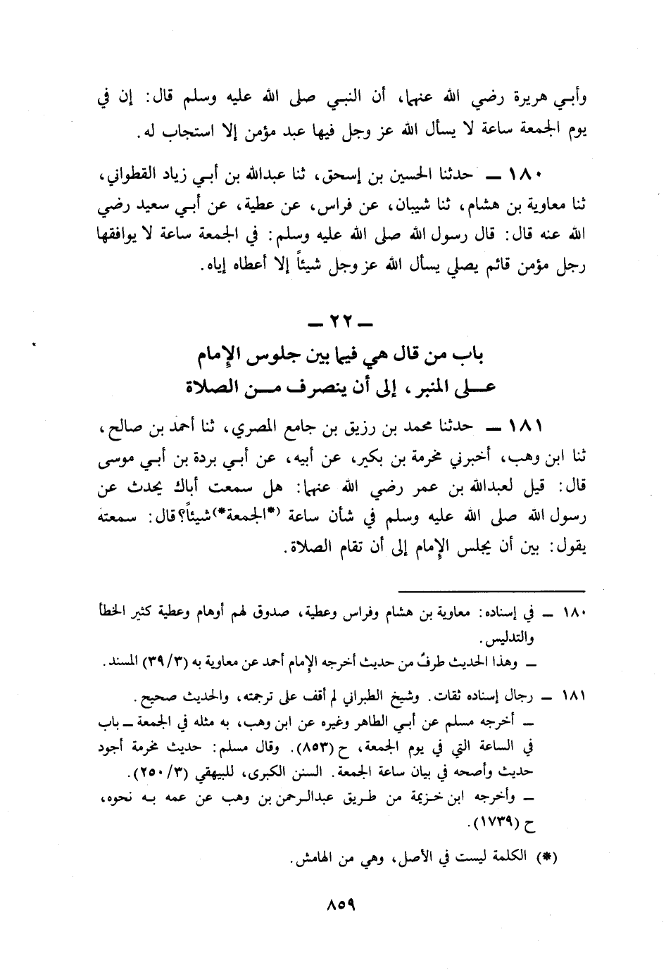 181- حَدَّثَنَا مُحَمَّدُ بْنُ رُزَيْقِ بْنِ جَامِعٍ الْمِصْرِيُّ، حَدَّثَنَا أَحْمَدُ بْنُ صَالِحٍ، حَدَّثَنَا ابْنُ وَهْبٍ، أَخْبَرَنِي مَخْرَمَةُ بْنُ بُكَيْرٍ، عَنْ أَبِيهِ، عَنْ أَبِي بُرْدَةَ بْنِ أَبِي مُوسَى، قَالَ: قِيلَ لِعَبْدِ اللهِ بْنِ عُمَرَ رَضِيَ اللَّهُ عَنْهُمَا: هَلْ سَمِعْتَ أَبَاكَ يُحَدِّثُ عَنْ رَسُولِ اللهِ صَلى الله عَلَيه وَسَلم فِي شَأْنِ سَاعَةِ الْجُمُعَةِ شَيْئًا؟ قَالَ: سَمِعْتُهُ يَقُولُ: بَيْنَ أَنْ يَجْلِسَ الإِمَامُ إِلَى أَنْ تُقَامَ الصَّلاَةُ.