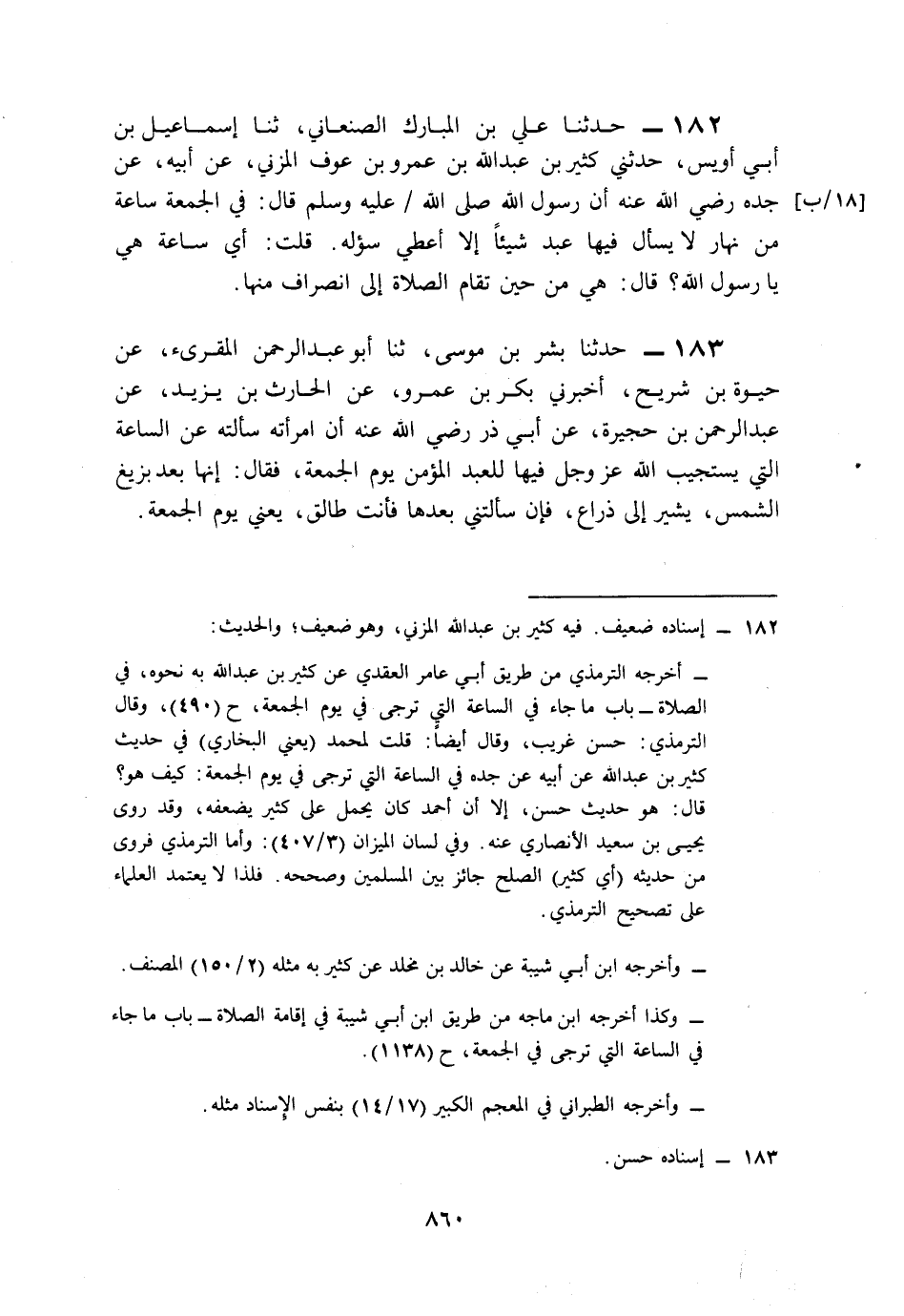 182- حَدَّثَنَا عَلِيُّ بْنُ الْمُبَارَكِ الصَّنْعَانِيُّ، حَدَّثَنَا إِسْمَاعِيلُ بْنُ أَبِي أُوَيْسٍ، حَدَّثَنِي كَثِيرُ بْنُ عَبْدِ اللهِ بْنِ عَمْرِو بْنِ عَوْفٍ الْمُزَنِيُّ، عَنْ أَبِيهِ، عَنْ جَدِّهِ، رَضِيَ اللَّهُ عَنْهُ, أَنَّ رَسُولَ اللهِ صَلى الله عَلَيه وَسَلم قَالَ: فِي الْجُمُعَةِ سَاعَةٌ مِنْ نَهَارٍ لاَ يَسْأَلُ فِيهَا عَبْدٌ شَيْئًا, إِلاَّ أُعْطِيَ سُؤْلَهُ, قُلْتُ: أَيُّ سَاعَةٍ هِيَ يَا رَسُولَ اللهِ؟ قَالَ: هِيَ مِنْ حِينَ تُقَامُ الصَّلاَةُ, إِلَى انْصِرَافٍ مِنْهَا.