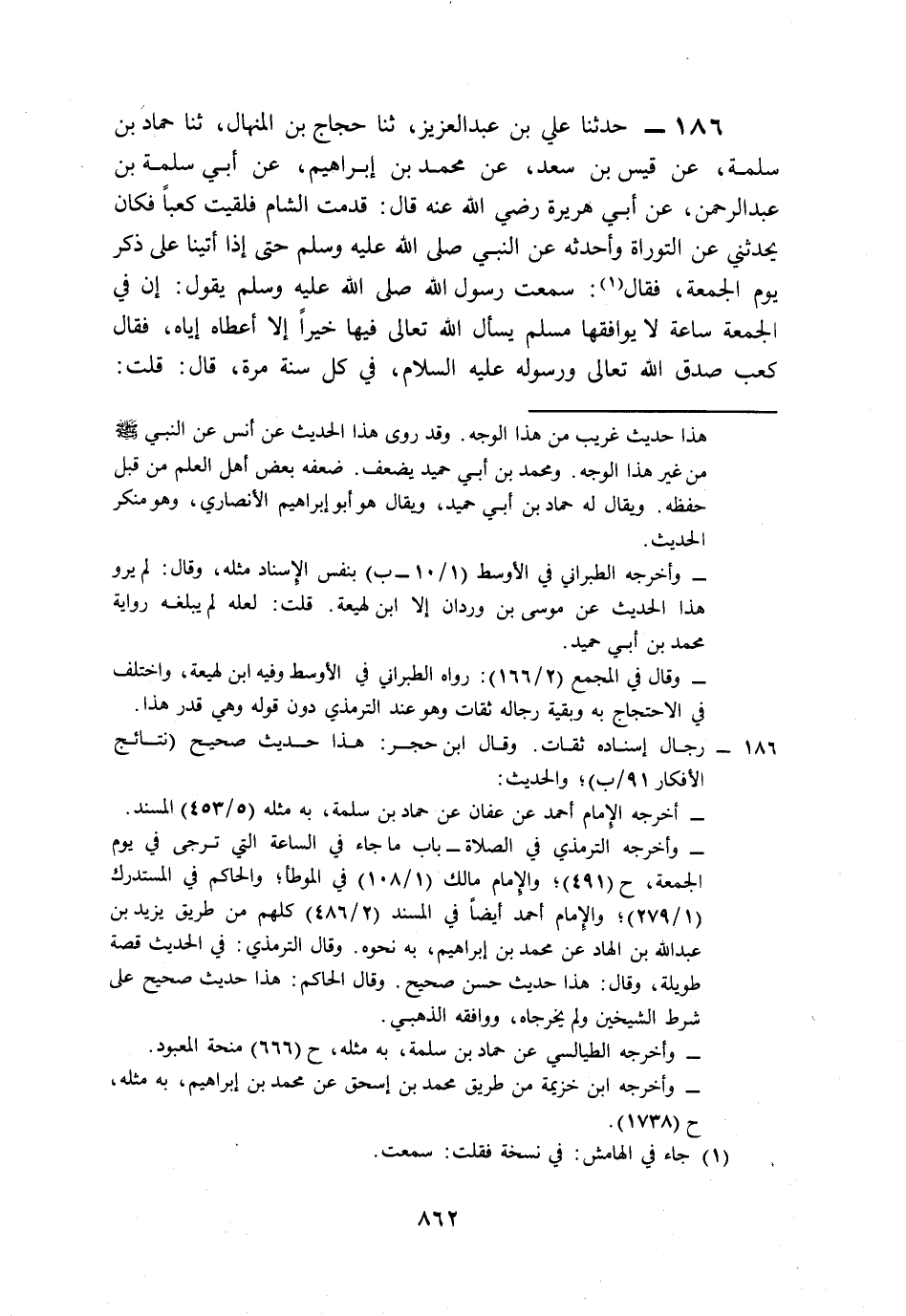 186- حَدَّثَنَا عَلِيُّ بْنُ عَبْدِ الْعَزِيزِ، حَدَّثَنَا حَجَّاجُ بْنُ الْمِنْهَالِ، حَدَّثَنَا حَمَّادُ بْنُ سَلَمَةَ، عَنْ قَيْسِ بْنِ سَعْدٍ، عَنْ مُحَمَّدِ بْنِ إِبْرَاهِيمَ، عَنْ أَبِي سَلَمَةَ بْنِ عَبْدِ الرَّحْمَنِ، عَنْ أَبِي هُرَيْرَةَ، رَضِيَ اللَّهُ عَنْهُ قَالَ: قَدِمْتُ الشَّامَ, فَلَقِيتُ كَعْبًا, فَكَانَ يُحَدِّثُنِي عَنِ التَّوْرَاةِ, وَأُحَدِّثُهُ عَنِ النَّبِيِّ صَلى الله عَلَيه وَسَلم, حَتَّى إِذَا أَتَيْنَا عَلَى ذِكْرِ يَوْمِ الْجُمُعَةِ, فَقَالَ: سَمِعْتُ رَسُولَ اللهِ صَلى الله عَلَيه وَسَلم يَقُولُ: إِنَّ فِي الْجُمُعَةِ سَاعَةً لاَ يُوَافِقُهَا مُسْلِمٌ يَسْأَلُ اللَّهَ تَعَالَى فِيهَا خَيْرًا, إِلاَّ أَعْطَاهُ إِيَّاهُ, فَقَالَ كَعْبٌ: صَدَقَ اللَّهُ تَعَالَى وَرَسُولُهُ عَلَيْهِ السَّلاَمُ، فِي كُلِّ سَنَةٍ مَرَّةً؟ قَالَ: قُلْتُ: لاَ، فَنَظَرَ كَعْبٌ سَاعَةً, ثُمَّ قَالَ: صَدَقَ اللَّهُ وَرَسُولُهُ، فِي كُلِّ شَهْرٍ مَرَّةً؟ قُلْتُ: لاَ،