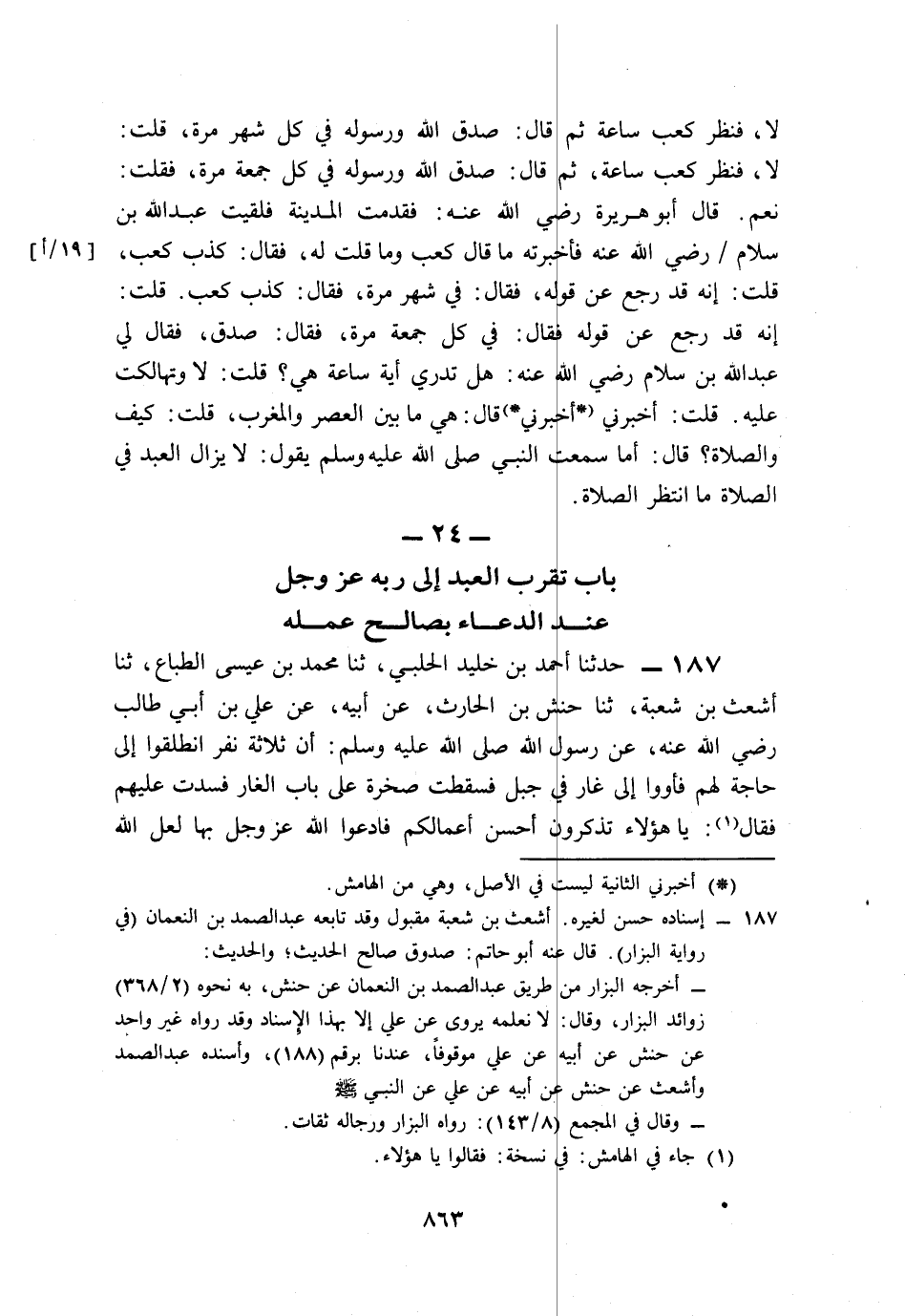 187- حَدَّثَنَا أَحْمَدُ بْنُ خُلَيْدٍ الْحَلَبِيُّ، حَدَّثَنَا مُحَمَّدُ بْنُ عِيسَى الطَّبَّاعُ، حَدَّثَنَا أَشْعَثُ بْنُ شُعْبَةَ، حَدَّثَنَا حَنَشُ بْنُ الْحَارِثِ، عَنْ أَبِيهِ، عَنْ عَلِيِّ بْنِ أَبِي طَالِبٍ، رَضِيَ اللَّهُ عَنْهُ, عَنْ رَسُولِ اللهِ صَلى الله عَلَيه وَسَلم: إِنَّ ثَلاَثَةَ نَفَرٍ انْطَلَقُوا إِلَى حَاجَةٍ لَهُمْ، فَأَوَوْا إِلَى غَارٍ فِي جَبَلٍ، فَسَقَطَتْ صَخْرَةٌ عَلَى بَابِ الْغَارِ، فَسَدَّتْ عَلَيْهِمْ، فَقَالَ: يَا هَؤُلاَءِ, تَذْكُرُونَ أَحْسَنَ أَعْمَالِكُمْ، فَادْعُوا اللَّهَ عَزَّ وَجَلَّ بِهَا, لَعَلَّ اللَّهَ تَعَالَى يُفَرِّجُ عَنْكُمْ بِهَا، فَقَالَ أَحَدُهُمُ: اللَّهُمَّ إِنَّهُ كَانَ لِي امْرَأَةٌ صَدِيقَةٌ, أُطِيلُ الِاخْتِلاَفَ إِلَيْهَا, حَتَّى أَدْرَكْتُ مِنْهَا حَاجَتِي,