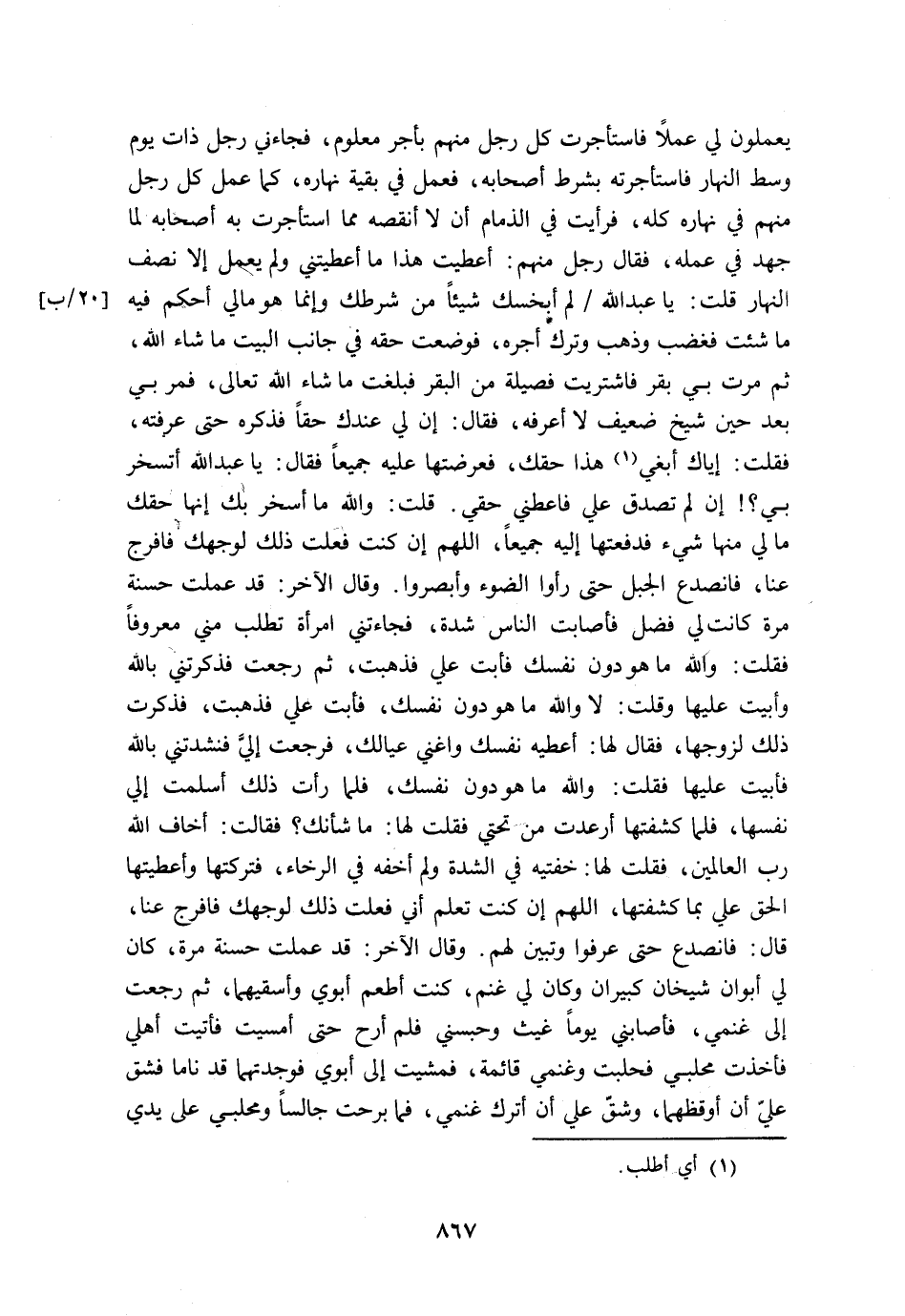 فَغَضِبَ وَذَهَبَ وَتَرَكَ أَجْرَهُ، فَوَضَعْتُ حَقَّهُ فِي جَانِبِ الْبَيْتِ مَا شَاءَ اللَّهُ، ثُمَّ مَرَّتْ بِي بَقَرٌ, فَاشْتَرَيْتُ فَصِيلَةً مِنَ الْبَقَرِ, فَبَلَغَتْ مَا شَاءَ اللَّهُ تَعَالَى، فَمَرَّ بِي بَعْدَ حِينٍ شَيْخٌ ضَعِيفٌ لاَ أَعْرِفُهُ, فَقَالَ: إِنَّ لِي عِنْدَكَ حَقًّا, فَذَكَرَهُ, حَتَّى عَرَفْتُهُ, فَقُلْتُ: إِيَّاكَ أَبْغِي، هَذَا حَقُّكَ, فَعَرَضْتُهَا عَلَيْهِ جَمِيعًا, فَقَالَ: يَا عَبْدَ اللهِ, أَتَسْخَرُ بِي, إِنْ لَمْ تَصَدَّقْ عَلَيَّ, فَأَعْطِنِي حَقِّي، قُلْتُ: وَاللهِ مَا أَسْخَرُ بِكَ إِنَّهَا حَقَّكَ, مَا لِي مِنْهَا شَيْءٌ, فَدَفَعْتُهَا إِلَيْهِ جَمِيعًا، اللَّهُمَّ إِنْ كُنْتُ فَعَلْتُ ذَلِكَ لِوَجْهِكَ, فَافْرُجْ عَنَّا, فَانْصَدَعَ الْجَبَلُ, حَتَّى رَأَوُا الضَّوْءَ وَأَبْصَرُوا، وَقَالَ الآخَرُ: قَدْ عَمِلْتُ حَسَنَةً مَرَّةً، كَانَتْ لِي فَضْلٌ, فَأَصَابَتِ النَّاسَ شِدَّةٌ,