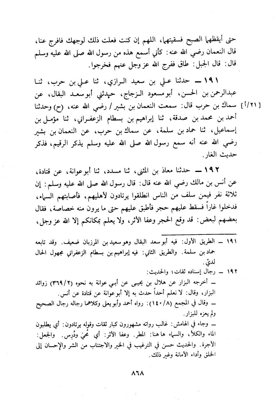 191- حَدَّثَنَا عَلِيُّ بْنُ سَعِيدِ الرَّازِيُّ، حَدَّثَنَا عَلِيُّ بْنُ حَرْبٍ، حَدَّثَنَا عَبْدُ الرَّحْمَنِ بْنُ الْحَسَنِ, أَبُو مَسْعُودٍ الزَّجَّاجُ، حَدَّثَنِي أَبُو سَعْدٍ الْبَقَّالُ، عَنْ سِمَاكِ بْنِ حَرْبٍ، قَالَ سَمِعْتُ النُّعْمَانَ بْنَ بَشِيرٍ، رَضِيَ اللَّهُ عَنْهُ (ح) وَحَدَّثَنَا أَحْمَدُ بْنُ مُحَمَّدِ بْنِ صَدَقَةَ، حَدَّثَنَا إِبْرَاهِيمُ بْنُ بِسْطَامٍ الزَّعْفَرَانِيُّ، حَدَّثَنَا مُؤَمَّلُ بْنُ إِسْمَاعِيلَ، حَدَّثَنَا حَمَّادُ بْنُ سَلَمَةَ، عَنْ سِمَاكِ بْنِ حَرْبٍ، عَنِ النُّعْمَانِ بْنِ بَشِيرٍ، رَضِيَ اللَّهُ عَنْهُ, أَنَّهُ سَمِعَ رَسُولَ اللهِ صَلى الله عَلَيه وَسَلم يَذْكُرُ الرَّقِيمَ, فَذَكَرَ حَدِيثَ الْغَارِ.
