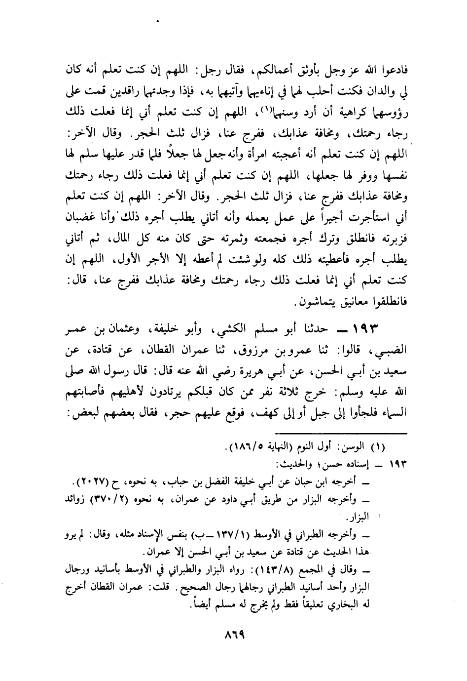 193- حَدَّثَنَا أَبُو مُسْلِمٍ الْكَشِّيُّ، وَأَبُو خَلِيفَةَ, وَعُثْمَانُ بْنُ عُمَرَ الضَّبِّيُّ، قَالُوا: حَدَّثَنَا عَمْرُو بْنُ مَرْزُوقٍ، حَدَّثَنَا عِمْرَانُ الْقَطَّانُ، عَنْ قَتَادَةَ، عَنْ سَعِيدِ بْنِ أَبِي الْحَسَنِ، عَنْ أَبِي هُرَيْرَةَ، رَضِيَ اللَّهُ عَنْهُ قَالَ: قَالَ رَسُولُ اللهِ صَلى الله عَلَيه وَسَلم: خَرَجَ ثَلاَثَةُ نَفَرٍ مِمَّنْ كَانَ قَبْلَكُمْ يَرْتَادُونَ لِأَهْلِيهِمْ, فَأَصَابَتْهُمُ السَّمَاءُ, فَلَجَأُوا إِلَى جَبَلٍ, أَوْ إِلَى كَهْفٍ, فَوَقَعَ عَلَيْهِمْ حَجَرٌ, فَقَالَ بَعْضُهُمْ لِبَعْضٍ: وَقَعَ الْحَجَرُ, وَعَفَا الأَثَرُ, وَلاَ يَعْلَمُ مَكَانَكُمْ إِلاَّ اللَّهُ عَزَّ وَجَلَّ، ادْعُوا بِأَوْثَقِ أَعْمَالِكُمْ، فَقَالَ أَحَدُهُمْ: كَانَ لِي وَالِدَانِ, وَكُنْتُ أَحْلُبُ لَهُمَا فِي إِنَاءَيْهِمَا, فَإِذَا أَتَيْتُهُمَا وَهُمَا نَائِمَانِ قُمْتُ قَائِمًا, حَتَّى يَسْتَيْقِظَا مَتَى اسْتَيْقَظَا, وَكَرِهْتُ أَنْ تَدُورَ سِنَتُهُمَا فِي رُؤُوسِهِمَا، فَإِذَا اسْتَيْقَظَا شَرِبَا، اللَّهُمَّ إِنْ كُنْتَ تَعْلَمُ إِنَّمَا فَعَلْتُ ذَلِكَ رَجَاءَ رَحْمَتِكَ, وَخَشْيَةَ عَذَابِكَ, فَافْرُجْ عَنَّا، فَزَالَ ثُلُثُ الْحَجَرِ،