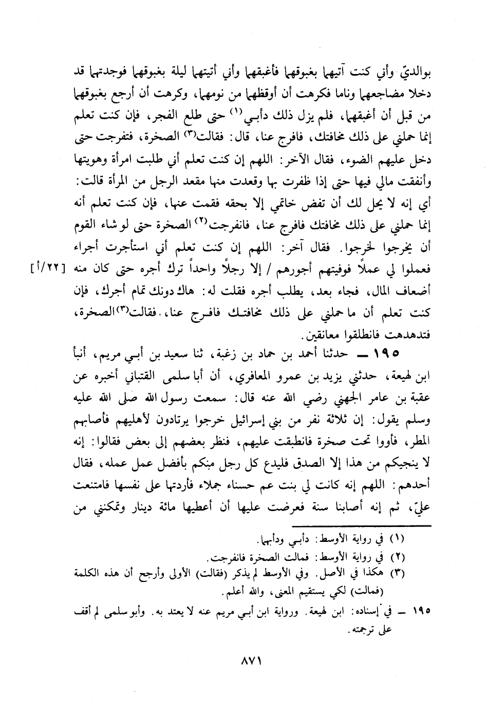195- حَدَّثَنَا أَحْمَدُ بْنُ حَمَّادِ بْنِ زُغْبَةَ، حَدَّثَنَا سَعِيدُ بْنُ أَبِي مَرْيَمَ، أَخْبَرَنَا ابْنُ لَهِيعَةَ، حَدَّثَنِي يَزِيدُ بْنُ عَمْرٍو الْمَعَافِرِيُّ، أَنَّ أَبَا سَلْمَى الْقِتْبَانِيَّ أَخْبَرَهُ عَنْ عُقْبَةَ بْنِ عَامِرٍ الْجُهَنِيِّ، رَضِيَ اللَّهُ عَنْهُ قَالَ: سَمِعْتُ رَسُولَ اللهِ صَلى الله عَلَيه وَسَلم يَقُولُ: إِنَّ ثَلاَثَةَ نَفَرٍ مِنْ بَنِي إِسْرَائِيلَ خَرَجُوا يَرْتَادُونَ لِأَهْلِيهِمْ, فَأَصَابَهُمُ الْمَطَرُ، فَأَوَوْا تَحْتَ صَخْرَةٍ، فَانْطَبَقَتْ عَلَيْهِمْ, فَنَظَرَ بَعْضُهُمْ إِلَى بَعْضٍ, فَقَالُوا: إِنَّهُ لاَ يُنْجِيكُمْ مِنْ هَذَا إِلاَّ الصِّدْقُ, فَلْيَدْعُ كُلُّ رَجُلٍ مِنْكُمْ بِأَفْضَلَ عَمَلٍ عَمِلَهُ, فَقَالَ أَحَدُهُمُ: اللَّهُمَّ إِنَّهُ كَانَتْ لِي بِنْتُ عَمٍّ حَسْنَاءُ جَمْلاَءُ, فَأَرَدْتُهَا عَلَى نَفْسِهَا, فَامْتَنَعَتْ عَلَيَّ، ثُمَّ إِنَّهُ أَصَابَنَا سَنَةٌ,