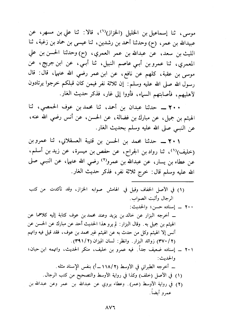 201- حَدَّثَنَا مُحَمَّدُ بْنُ الْحَسَنِ بْنِ قُتَيْبَةَ الْعَسْقَلاَنِيُّ، حَدَّثَنَا عَمْرُو بْنُ (خُلَيْفٍ)، حَدَّثَنَا رَوَّادُ بْنُ الْجَرَّاحِ، عَنْ حَفْصِ بْنِ مَيْسَرَةَ، عَنْ زَيْدِ بْنِ أَسْلَمَ، عَنْ عَطَاءِ بْنِ يَسَارٍ، عَنْ عَبْدِ اللهِ بْنِ عَمْرٍو، رَضِيَ اللَّهُ عَنْهُمَا, عَنِ النَّبِيِّ صَلى الله عَلَيه وَسَلم قَالَ: خَرَجَ ثَلاَثَةُ نَفَرٍ, فَذَكَرَ حَدِيثَ الْغَارِ.