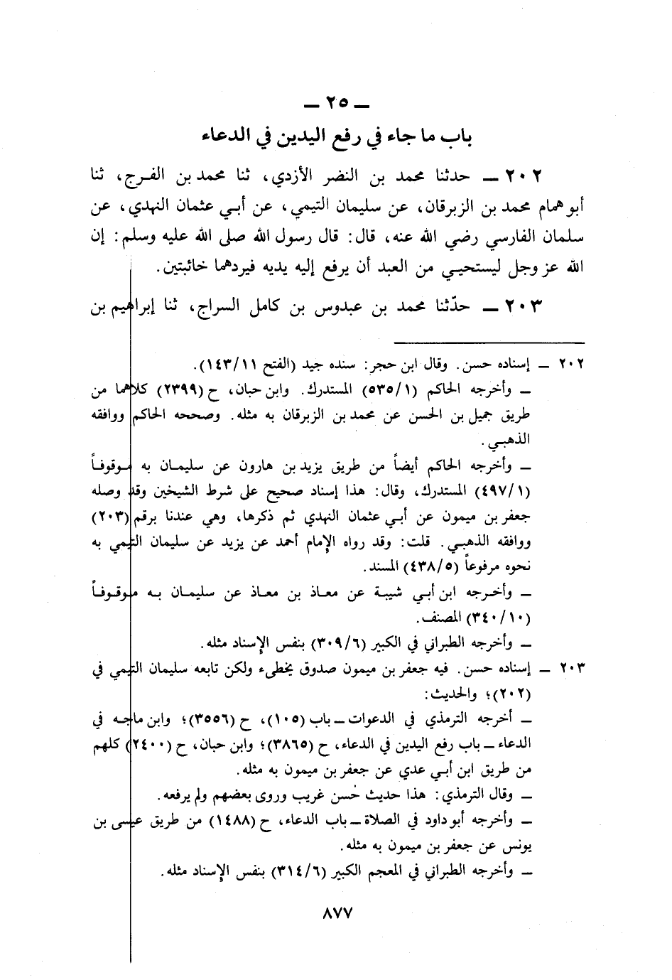 202- حَدَّثَنَا مُحَمَّدُ بْنُ النَّضْرِ الأَزْدِيُّ، حَدَّثَنَا مُحَمَّدُ بْنُ الْفَرَجِ، حَدَّثَنَا أَبُو هَمَّامٍ مُحَمَّدُ بْنُ الزِّبْرِقَانِ، عَنْ سُلَيْمَانَ التَّيْمِيِّ، عَنْ أَبِي عُثْمَانَ النَّهْدِيِّ، عَنْ سَلْمَانَ الْفَارِسِيِّ رَضِيَ اللَّهُ عَنْهُ, قَالَ: قَالَ رَسُولُ اللهِ صَلى الله عَلَيه وَسَلم: إِنَّ اللَّهَ عَزَّ وَجَلَّ لَيَسْتَحْيِي مِنَ الْعَبْدِ أَنْ يَرْفَعَ إِلَيْهِ يَدَيْهِ فَيَرُدَّهُمَا خَائِبَتَيْنِ.