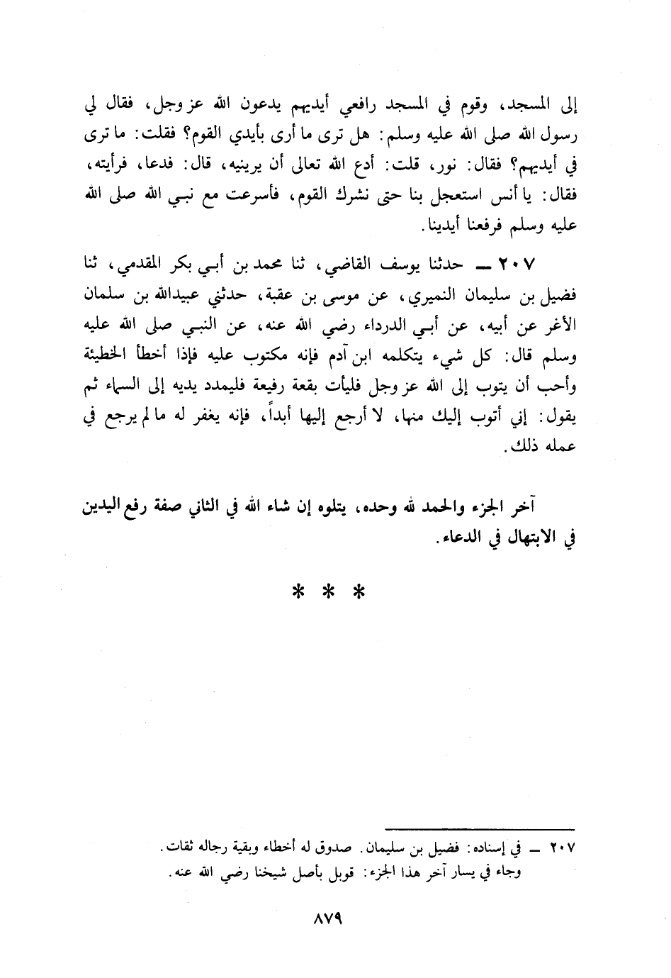 207- حَدَّثَنَا يُوسُفُ الْقَاضِي، حَدَّثَنَا مُحَمَّدُ بْنُ أَبِي بَكْرٍ الْمُقَدَّمِيُّ، حَدَّثَنَا فُضَيْلُ بْنُ سُلَيْمَانَ النُّمَيْرِيُّ، عَنْ مُوسَى بْنِ عُقْبَةَ، حَدَّثَنِي عُبَيْدُ اللهِ بْنُ سَلْمَانَ الأَغَرُّ، عَنْ أَبِيهِ، عَنْ أَبِي الدَّرْدَاءِ، رَضِيَ اللَّهُ عَنْهُ, عَنِ النَّبِيِّ صَلى الله عَلَيه وَسَلم قَالَ: كُلُّ شَيْءٍ يَتَكَلَّمُهُ ابْنُ آدَمَ فَإِنَّهُ مَكْتُوبٌ عَلَيْهِ، فَإِذَا أَخْطَأَ الْخَطِيئَةَ, وَأَحَبَّ أَنْ يَتُوبَ إِلَى اللهِ عَزَّ وَجَلَّ, فَلْيَأْتِ بُقْعَةً رَفِيعَةً, فَلْيَمْدُدْ يَدَيْهِ إِلَى السَّمَاءِ، ثُمَّ يَقُولُ: إِنِّي أَتُوبُ إِلَيْكَ مِنْهَا, لاَ أَرْجِعُ إِلَيْهَا أَبَدًا، فَإِنَّهُ يَغْفِرُ لَهُ مَا لَمْ يَرْجِعْ فِي عَمَلِهِ ذَلِكَ.