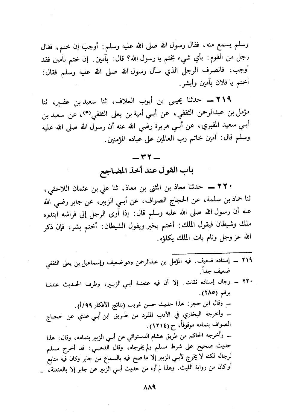 220- حَدَّثَنَا مُعَاذُ بْنُ الْمُثَنَّى بْنِ مُعَاذٍ، حَدَّثَنَا عَلِيُّ بْنُ عُثْمَانَ اللاَّحِقِيُّ، حَدَّثَنَا حَمَّادُ بْنُ سَلَمَةَ، عَنِ الْحَجَّاجِ الصَّوَّافِ، عَنْ أَبِي الزُّبَيْرِ، عَنْ جَابِرٍ، رَضِيَ اللَّهُ عَنْهُ, أَنَّ رَسُولَ اللهِ صَلى الله عَلَيه وَسَلم قَالَ: إِذَا آوَى الرَّجُلُ إِلَى فِرَاشِهِ ابْتَدَرَهُ مَلَكٌ وَشَيْطَانٌ، فَيَقُولُ الْمَلَكُ: اخْتِمْ بِخَيْرٍ، وَيَقُولُ الشَّيْطَانُ: اخْتِمْ بِشَرٍّ، فَإِنْ ذَكَرَ اللَّهَ عَزَّ وَجَلَّ وَنَامَ بَاتَ الْمَلَكُ يَكْلَؤُهُ.