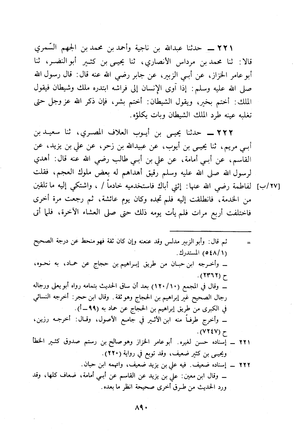 222- حَدَّثَنَا يَحْيَى بْنُ أَيُّوبَ الْعَلاَّفُ الْمِصْرِيُّ، حَدَّثَنَا سَعِيدُ بْنُ أَبِي مَرْيَمَ، حَدَّثَنَا يَحْيَى بْنُ أَيُّوبَ، عَنْ عُبَيْدِ اللهِ بْنِ زَحْرٍ، عَنْ عَلِيِّ بْنِ يَزِيدَ، عَنِ الْقَاسِمِ، عَنْ أَبِي أُمَامَةَ، عَنْ عَلِيِّ بْنِ أَبِي طَالِبٍ، رَضِيَ اللَّهُ عَنْهُ قَالَ: أُهْدِي لِرَسُولِ اللهِ صَلى الله عَلَيه وَسَلم رَقِيقٌ أَهدْاهُمْ لَهُ بَعْضُ مُلُوكِ الْعَجَمِ، فَقُلْتُ لِفَاطِمَةَ رَضِيَ اللَّهُ عَنْهَا: ائْتِي أَبَاكِ فَاسْتَخْدِمِيهِ خَادِمًا وَاشْتَكِي إِلَيْهِ مَا تَلْقَيْنَ مِنَ الْخِدْمَةِ، فَانْطَلَقَتْ إِلَيْهِ فَلَمْ تَجِدْهُ، وَكَانَ يَوْمَ عَائِشَةَ، ثُمَّ رَجَعَتْ مَرَّةً أُخْرَى فَاخْتَلَفَتْ أَرْبَعَ مَرَّاتٍ فَلَمْ يَأْتِ يَوْمَهُ ذَلِكَ حَتَّى صَلَّى الْعِشَاءَ الآخِرَةَ، فَلَمَّا أَتَى أَخْبَرَتْهُ عَائِشَةُ رَضِيَ اللَّهُ عَنْهَا أَنَّ فَاطِمَةَ الْتَمَسَتْهُ أَرْبَعَ مَرَّاتٍ،