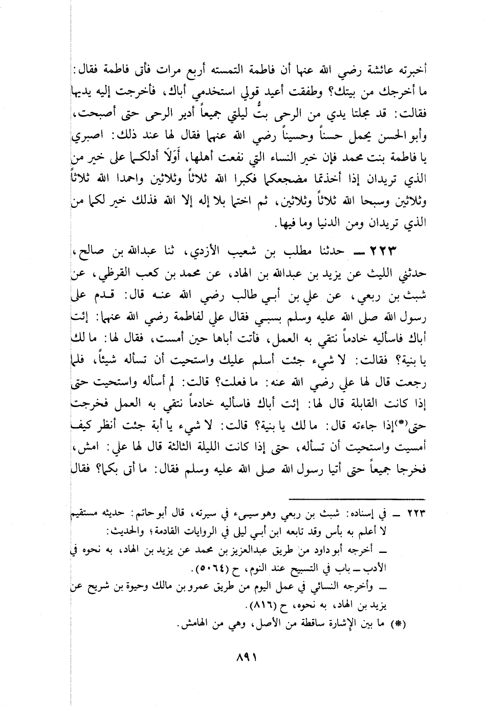 223- حَدَّثَنَا مُطَّلِبُ بْنُ شُعَيْبٍ الأَزْدِيُّ، حَدَّثَنَا عَبْدُ اللهِ بْنُ صَالِحٍ، حَدَّثَنِي اللَّيْثُ، عَنْ يَزِيدَ بْنِ عَبْدِ اللهِ بْنِ الْهَادِ، عَنْ مُحَمَّدِ بْنِ كَعْبٍ الْقُرَظِيِّ، عَنْ شَبَثِ بْنِ رِبْعِيٍّ، عَنْ عَلِيِّ بْنِ أَبِي طَالِبٍ، رَضِيَ اللَّهُ عَنْهُ قَالَ: قُدِمَ عَلَى رَسُولِ اللهِ صَلى الله عَلَيه وَسَلم بِسَبْي فَقَالَ عَلِيٌّ لِفَاطِمَةَ رَضِيَ اللَّهُ عَنْهُمَا: ائْتِ أَبَاكِ فَاسْأَلِيهِ خَادِمًا نَتَّقِي بِهِ الْعَمَلَ، فَأَتَتْ أَبَاهَا حِينَ أَمْسَتْ فَقَالَ لَهَا: مَا لَكِ يَا بُنَيَّةُ؟ فَقَالَتْ: لاَ شَيْءَ جِئْتُ أُسَلِّمُ عَلَيْكَ، وَاسْتَحْيَتْ أَنْ تَسْأَلَهُ شَيْئًا فَلَمَّا رَجَعَتْ قَالَ لَهَا عَلِيٌّ رَضِيَ اللَّهُ عَنْهُ: مَا فَعَلْتِ؟ قَالَتْ: لَمْ أَسْأَلْهُ وَاسْتَحَيْتُ، حَتَّى إِذَا كَانَتِ الْقَابِلَةُ قَالَ لَهَا: ائْتِ أَبَاكِ فَاسْأَلِيهِ خَادِمًا نَتَّقِي بِهِ الْعَمَلَ،