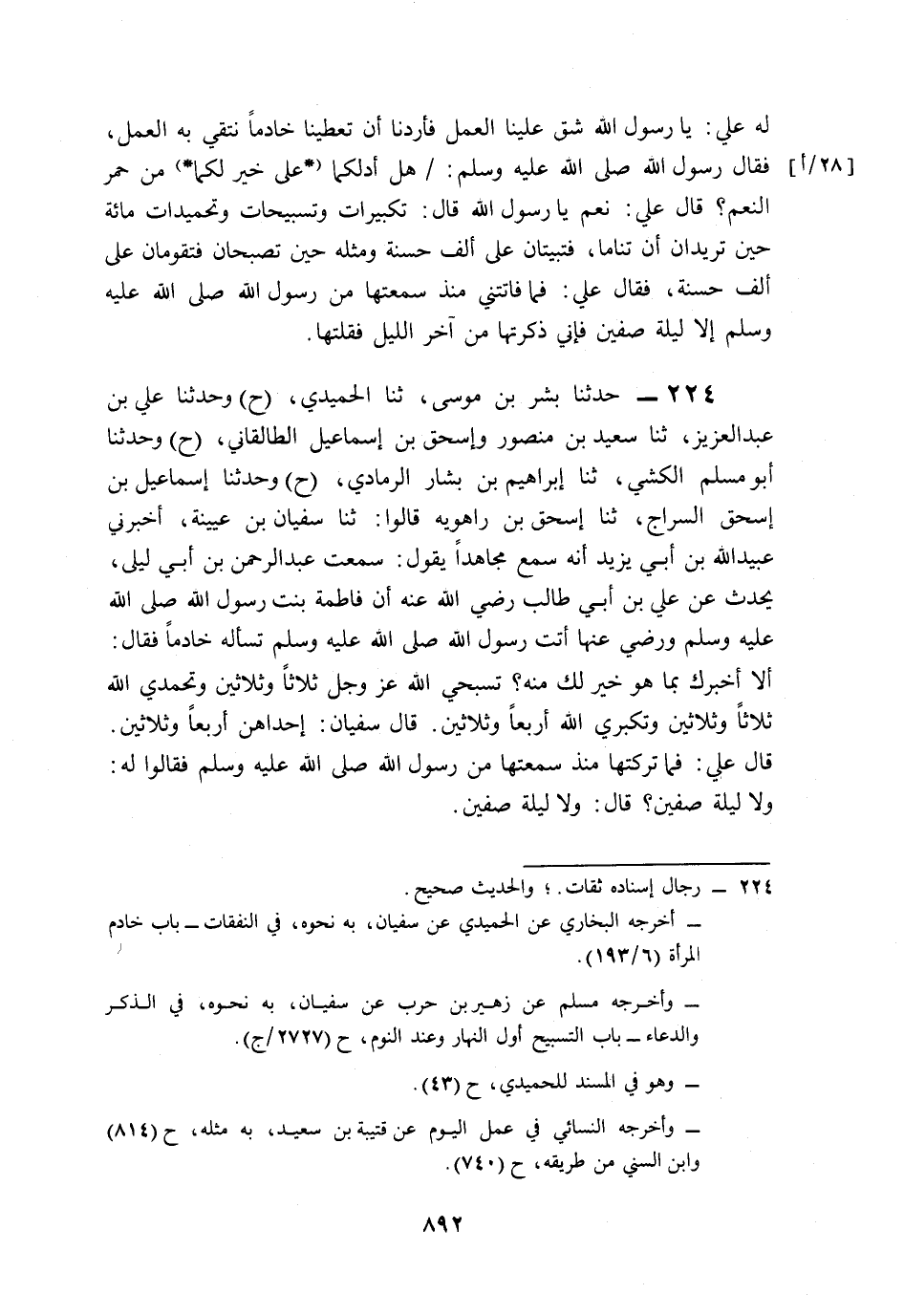 224- حَدَّثَنَا بِشْرُ بْنُ مُوسَى، حَدَّثَنَا الْحُمَيْدِيُّ (ح) وَحَدَّثَنَا عَلِيُّ بْنُ عَبْدِ الْعَزِيزِ، حَدَّثَنَا سَعِيدُ بْنُ مَنْصُورٍ، وَإِسْحَاقُ بْنُ إِسْمَاعِيلَ الطَّالْقَانِيُّ (ح) وَحَدَّثَنَا أَبُو مُسْلِمٍ الْكَشِّيُّ، حَدَّثَنَا إِبْرَاهِيمُ بْنُ بَشَّارِ الرَّمَادِيُّ (ح) وَحَدَّثَنَا إِسْمَاعِيلُ بْنُ إِسْحَاقِ السَّرَّاجُ، حَدَّثَنَا إِسْحَاقُ بْنُ رَاهَوَيْهِ، قَالُوا: حَدَّثَنَا سُفْيَانُ بْنُ عُيَيْنَةَ، أَخْبَرَنِي عُبَيْدُ اللهِ بْنُ أَبِي يَزِيدَ، أَنَّهُ سَمِعَ مُجَاهِدًا، يَقُولُ: سَمِعْتُ عَبْدَ الرَّحْمَنِ بْنَ أَبِي لَيْلَى، يُحَدِّثُ عَنْ عَلِيِّ بْنِ أَبِي طَالِبٍ، رَضِيَ اللَّهُ عَنْهُ, أَنَّ فَاطِمَةَ بِنْتَ رَسُولِ اللهِ، صَلى الله عَلَيه وَسَلم، وَرَضِيَ عَنْهَا أَتَتْ رَسُولَ اللهِ صَلى الله عَلَيه وَسَلم تَسْأَلُهُ خَادِمًا، فَقَالَ: أَلاَ أُخْبِرُكِ بِمَا هُوَ خَيْرٌ لَكِ مِنْهُ، تُسَبِّحِي اللَّهَ عَزَّ وَجَلَّ ثَلاَثًا وَثَلاَثِينَ، وَتَحْمَدِي اللَّهَ ثَلاَثًا وَثَلاَثِينَ، وَتُكَبِّرِي اللَّهَ أَرْبَعًا وَثَلاَثِينَ قَالَ سُفْيَانُ: إِحْدَاهُنَّ أَرْبَعًا وَثَلاَثِينَ، قَالَ عَلِيٌّ: فَمَا تَرَكْتُهَا مُنْذُ سَمِعْتُهَا مِنْ رَسُولِ اللهِ صَلى الله عَلَيه وَسَلم، فَقَالُوا لَهُ: وَلاَ لَيْلَةَ صِفِّينَ؟ قَالَ: وَلاَ لَيْلَةَ صِفِّينَ.